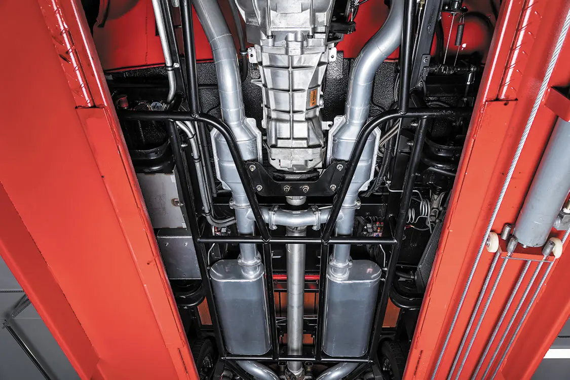 Additional custom touches include machined door handles and window cranks, stainless dash vents for the Vintage Air A/C, and a floor-mounted stainless and leather-wrapped e-brake just inside the driver’s side door.