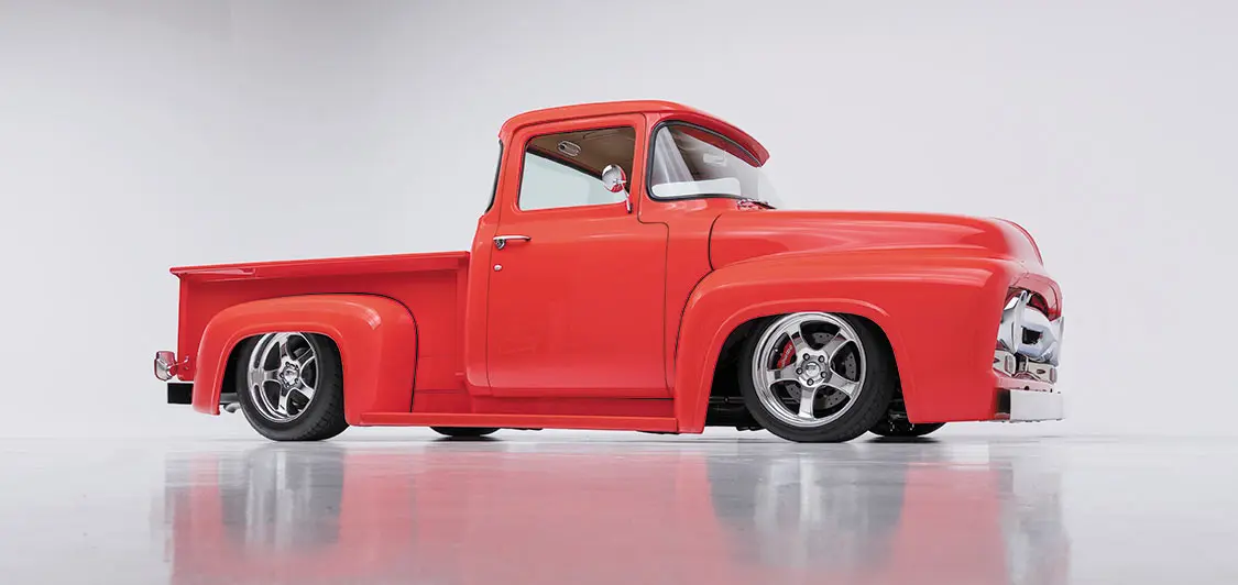 A sleek, sophisticated show-stopper: that’s what we thought when we laid eyes on this beautiful 1956 Ford F-100 for the first time. The secrets it kept were an added bonus! But when we found out that Tim Kerrigan, the original founder of Red Line Synthetic Oil was its owner, we thought it very fitting of this gorgeous red truck.