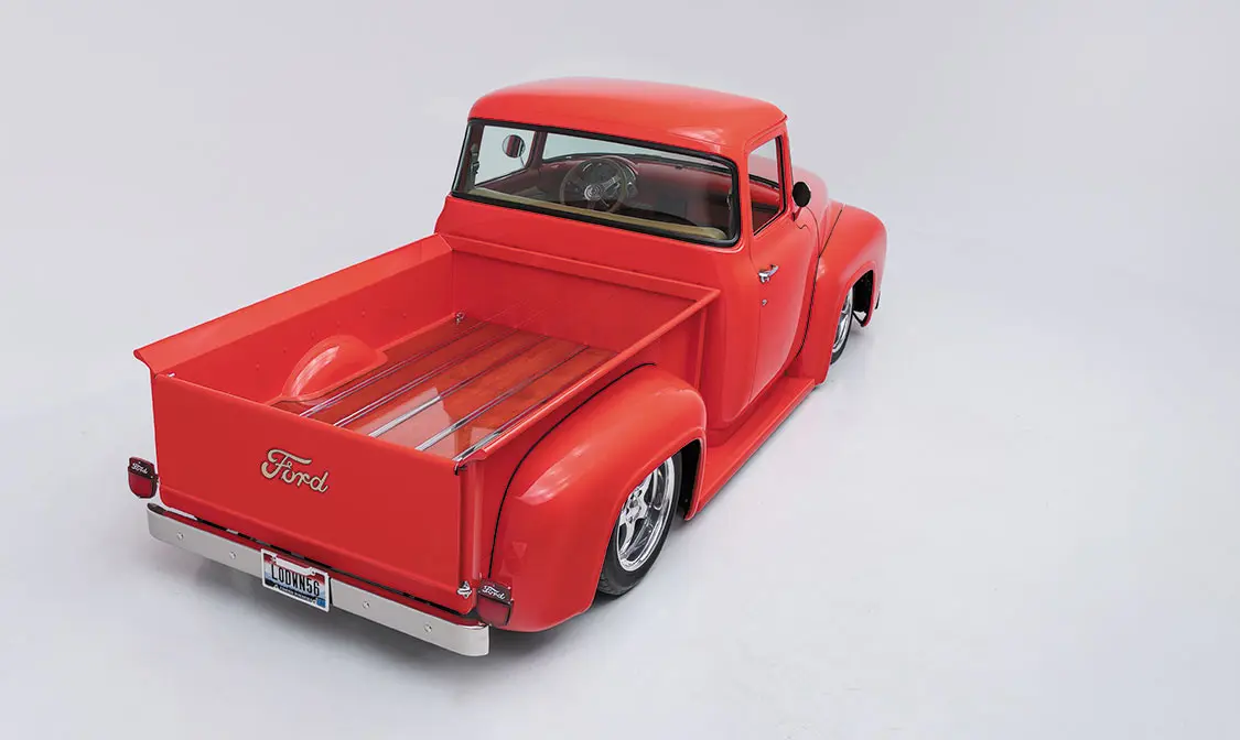 Upon further investigation you’ll find more details on the truck that take it to yet another level, like tubed rear fender wells, rounded door corners, and a modified and smoothed tailgate. Up front, the truck features a show-chromed stock grille, which matches polished stainless steel bumpers both front and rear. The bed on the truck is a piece of artwork in itself, having been widened and lifted both by 6 inches and fitted with a fully custom European cherry pine bed floor with stainless strips. Out back, a gorgeously laid gold leaf Ford emblem is proudly displayed in the middle of the tailgate, accentuating the red paint just enough to cause pause but without throwing it in your face.