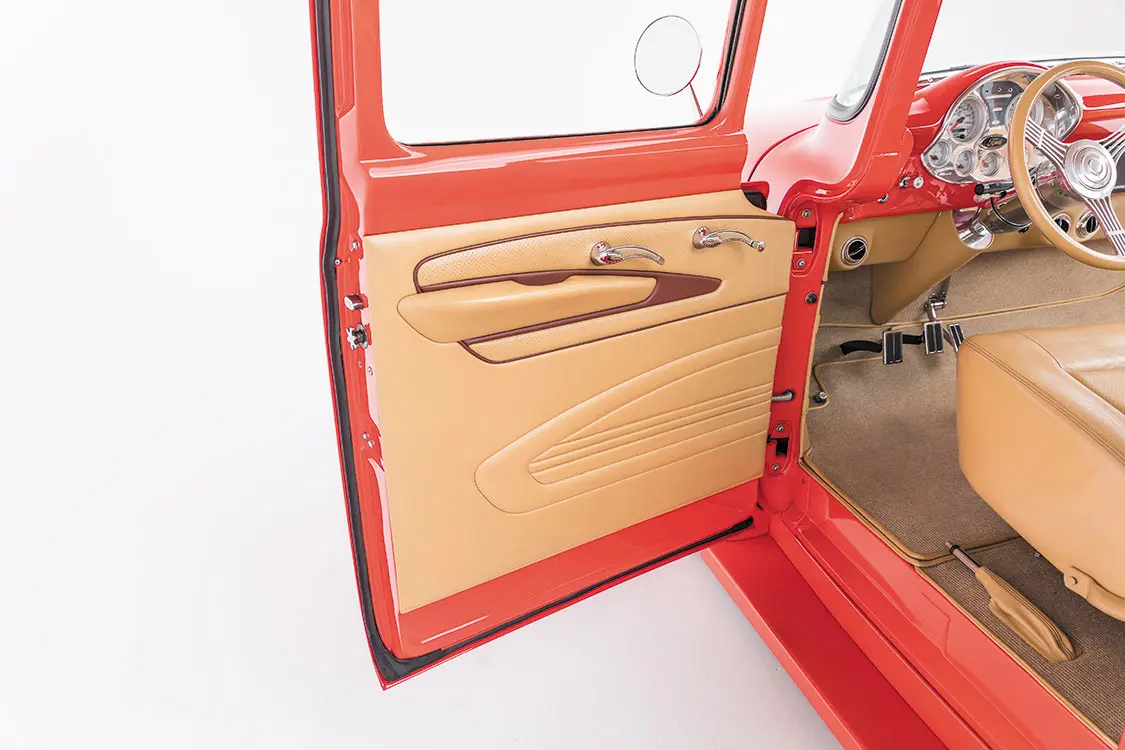 The interior of the truck, perfected by Gabe’s Street Rods Custom Interiors, is just as exquisite and ripe with subtle details. A custom bench seat upholstered in tan leather with burgundy accents sits prominently in the cab, flanked by matching custom door panels, headliner, and dash upholstery. Custom-fitted tan carpeting edged with matching tan leather sits below a custom 6-speed shifter, a modern pedal assembly, and a tilt steering column topped with a custom, leather-wrapped steering wheel also adorn the interior space.