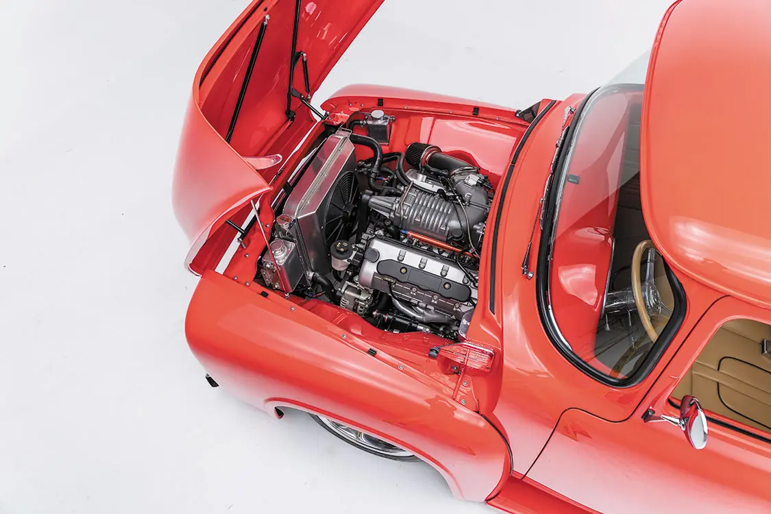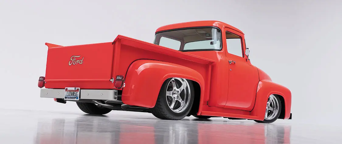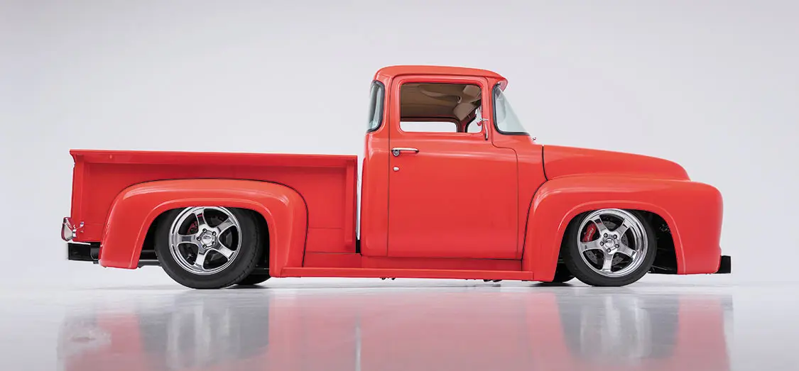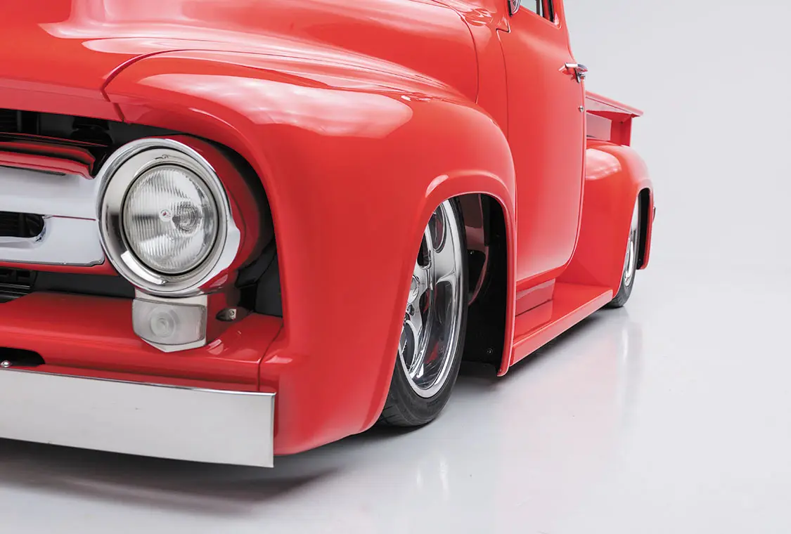 While the first thing you might notice about the truck is its sleek DuPont Bright Red paint, look a little deeper and you’ll be stunned by the perfect body lines of the truck. Not only was every body panel painstakingly smoothed to a glass-like finish on the F-100’s body, but every gap, from the door jambs to the rear fenders, was precisely and evenly perfected. The amount of time spent on getting this classic truck’s body this well fitted alone is telling of the caliber of this build.