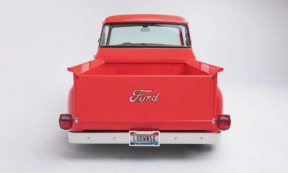 Upon further investigation you’ll find more details on the truck that take it to yet another level, like tubed rear fender wells, rounded door corners, and a modified and smoothed tailgate. Up front, the truck features a show-chromed stock grille, which matches polished stainless steel bumpers both front and rear. The bed on the truck is a piece of artwork in itself, having been widened and lifted both by 6 inches and fitted with a fully custom European cherry pine bed floor with stainless strips. Out back, a gorgeously laid gold leaf Ford emblem is proudly displayed in the middle of the tailgate, accentuating the red paint just enough to cause pause but without throwing it in your face.