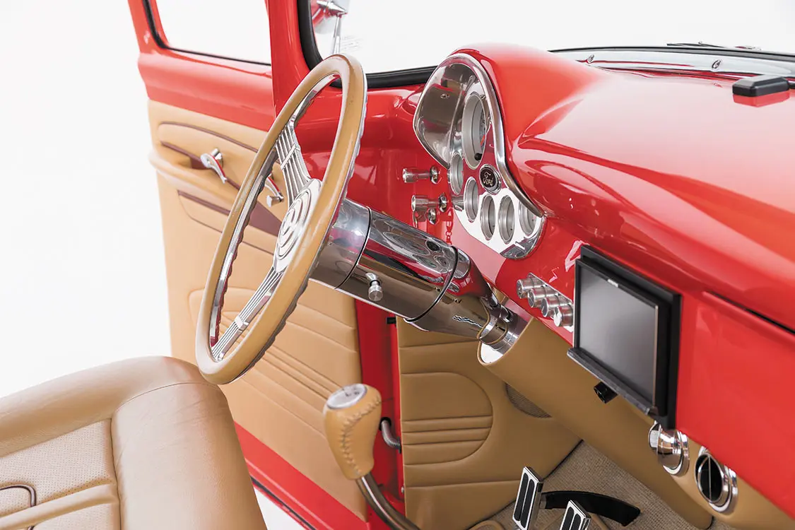 The interior of the truck, perfected by Gabe’s Street Rods Custom Interiors, is just as exquisite and ripe with subtle details. A custom bench seat upholstered in tan leather with burgundy accents sits prominently in the cab, flanked by matching custom door panels, headliner, and dash upholstery. Custom-fitted tan carpeting edged with matching tan leather sits below a custom 6-speed shifter, a modern pedal assembly, and a tilt steering column topped with a custom, leather-wrapped steering wheel also adorn the interior space.