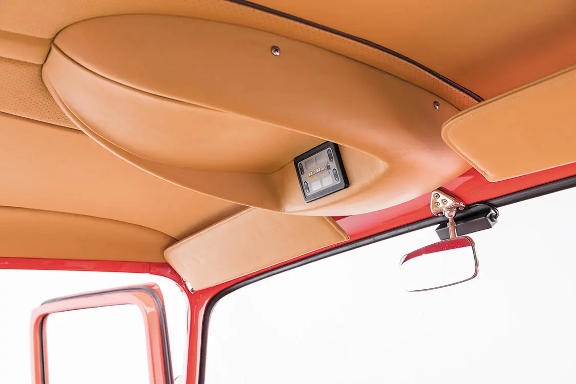 Front and center on the body color-matched dash sits an Alpine stereo and GPS system with a touchscreen, while a seven-gauge modernized Ultra-Lite cluster from Autometer gives speed, temperature and voltage readings to the driver in a classic-looking display. Overhead, an Air Ride Technologies controller sits in a custom console within easy reach of the driver to control the truck’s air-ride suspension system.