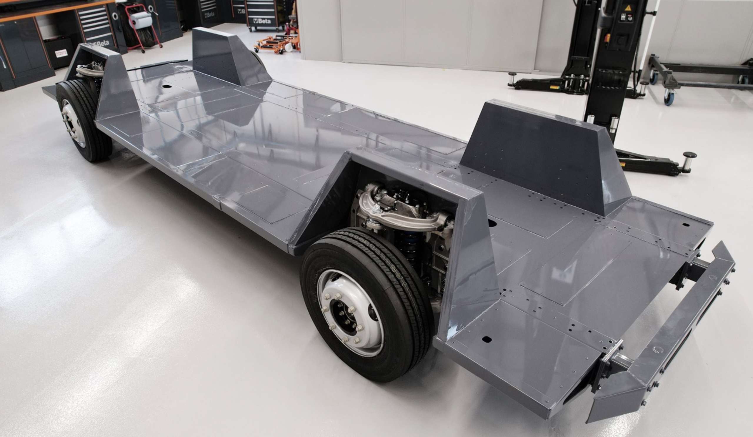 REE’s P7-B box truck delivers 4,400-pound payload and up, 150-mile range, so plenty enough to move the GMC Motorhome fiberglass body once the cab has been removed.