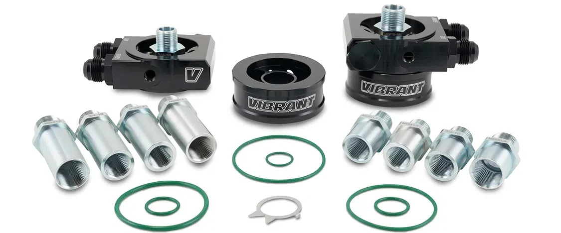 Vibrant’s Thermostatic Oil Cooler Sandwich Adapters are designed to bypass hot oil through a cooling loop to help keep engine oil temperatures under control while allowing you to keep your oil filter in the stock location.