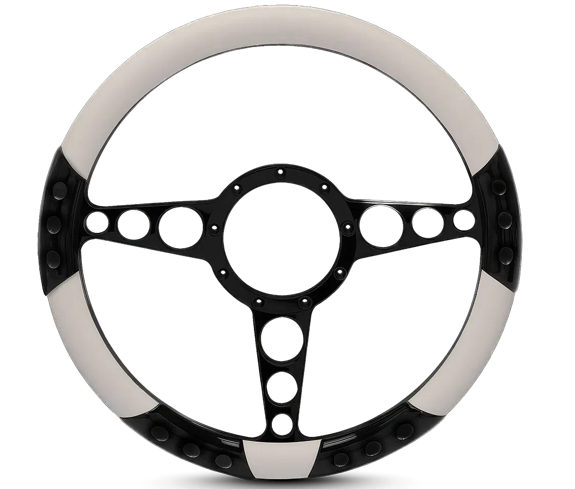 Eddie Motorsport’s Racer Sport model steering wheel has gloss black Fusioncoat spokes with a white grip. These wheels are precision CNC-machined in the USA from high quality 6061-T6 billet aluminum. The wheels are 13 1/2 inches diameter and include a synthetic leather half wrap grip. You can also wrap the wheel with your interior’s matching leather or vinyl.