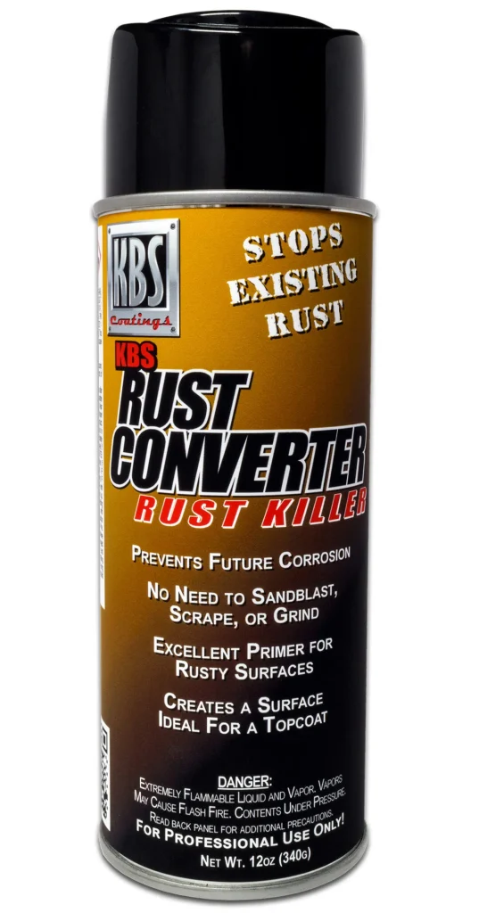 KBS Coatings Rust Converter chemically converts rust into a permanent, hard, and highly durable black surface. KBS Rust Converter is directly sprayed onto any iron or steel object that has tightly bonded or surface rust to kill the existing rust and stop new rust from forming. This quick-drying rust killer forms an inert primer layer that can stand alone or be painted over.