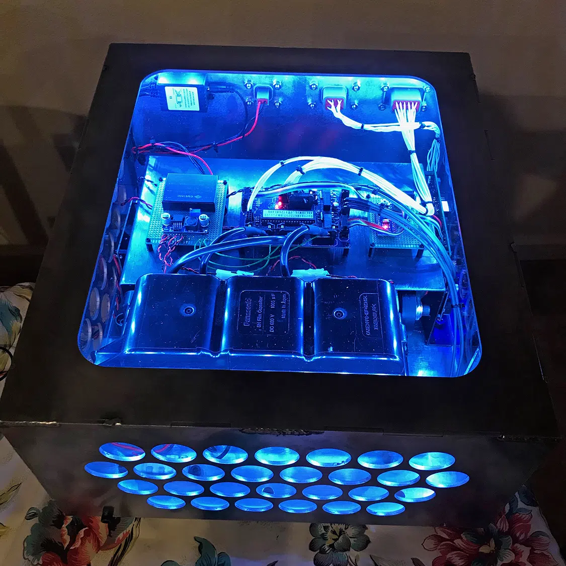 The final step involved installing the on-board charger and DC-DC converter. Jacob selected a 6.6kW Elcon charger and a DC-DC converter from a Chevy Volt. The Zeva BMS controls the charger, while the Chevy Volt’s DC-DC converter is managed by an Arduino microcontroller running his own software. Both components are mounted on a laser-cut 0.125-inch aluminum “floor” for the DeLorean’s frunk. For the charge port, Jacob aimed to maintain the car’s original fueling location—under the hood. He designed and laser-cut a 0.074-inch stainless steel base plate to frame the CCS port, allowing it to mount seamlessly to the DeLorean.