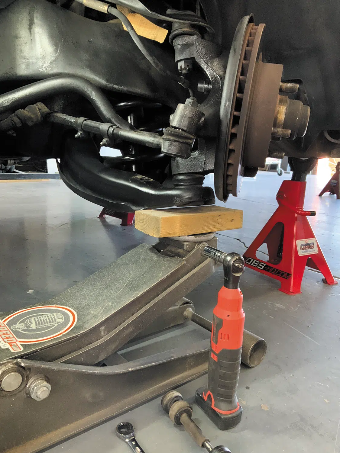 Reattach the lower ball joint and the tie rod end to the spindle. We set the retaining ring up approximately 1.5 inches as a starting point for ride height.