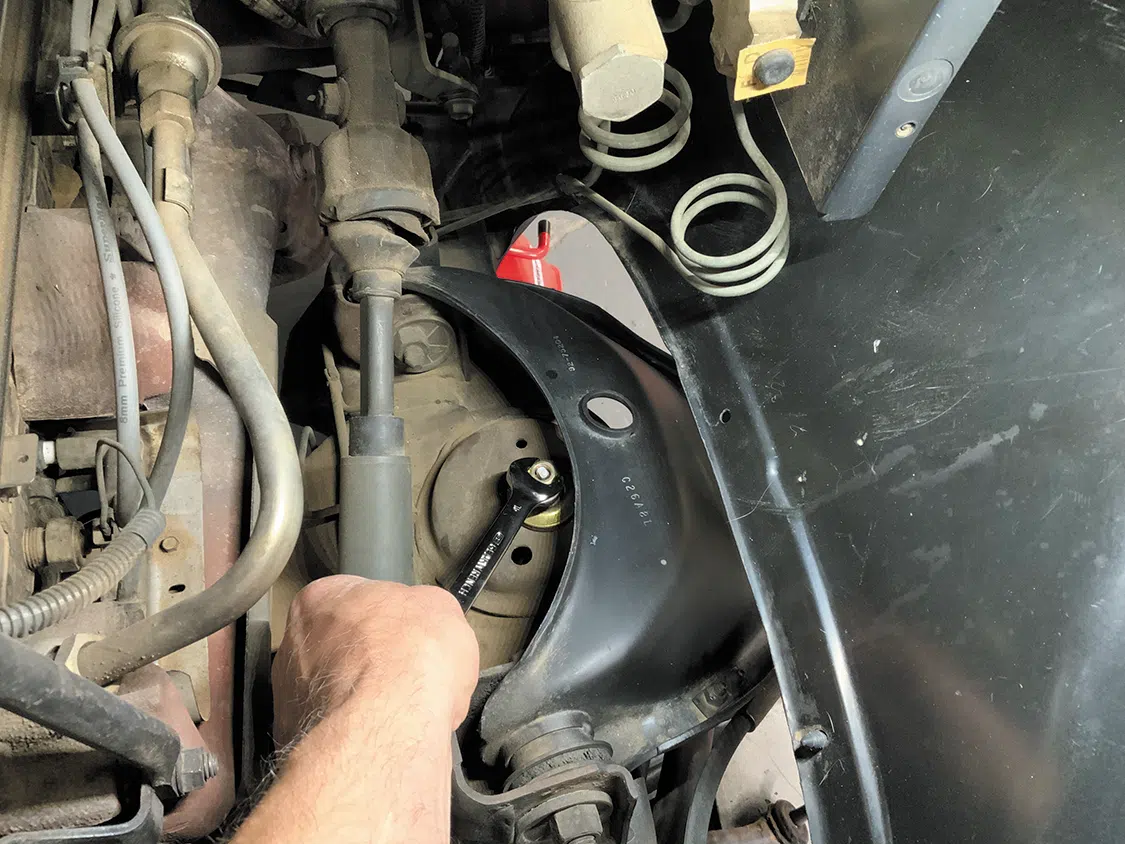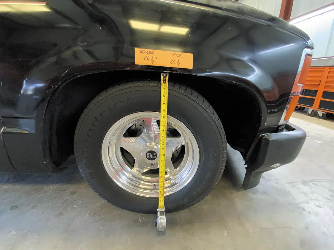 Using the supplied adjusting wrench, set the front ride height. We went 1 inch lower than before for a raked look. Now, we’re off to alignment, and then it’s back on the street for the Billet Beater!