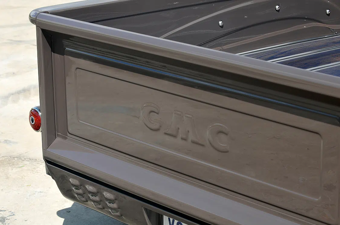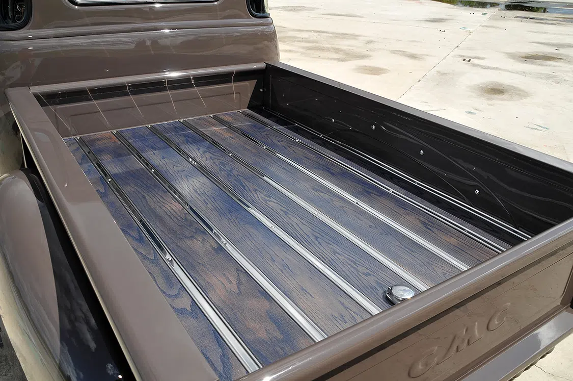 Originally, he planned to go with a Nardo Gray, but when Choppa tested a sample on the truck, his wife, Donna, said, “Absolutely no!” The search was back on as he tried to find something that would be unique enough to stand out and also please the wife. The final choice was a mixture blend starting with a ’50s style Sherwin Williams Volkswagen color and mixed with tan and beige. The wife agreed, and finally Kerry “Duck” Cunningham—a good friend who had painted his fair share of feature trucks—did his magic on the classic GMC.
