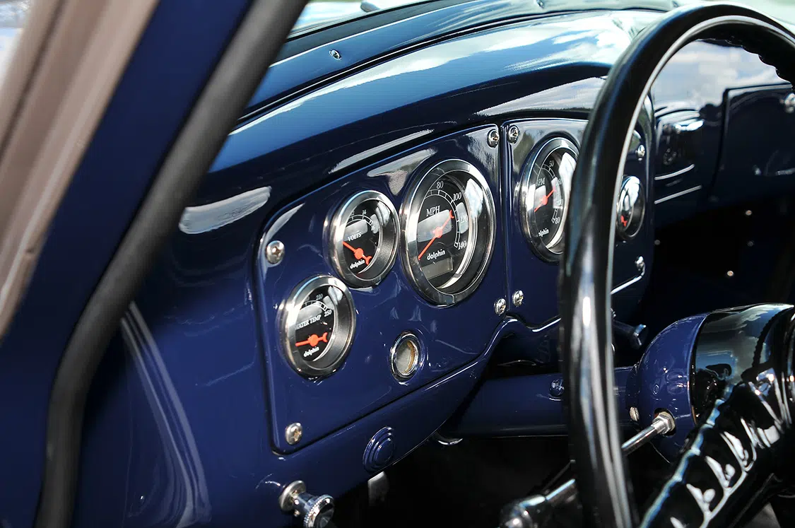 With only the interior left to bring back to life, Choppa found a 15-passenger Dodge church van sitting in the junkyard and removed the bench seat for his GMC. The original dashboard was replaced and all the door panels were reworked. The interior was painted factory blue to break up the lighter exterior color. Dolphin gauges were added to the dash, and a custom center console was built between the bench seat on the floor. The very last step to stain the board in the bed with the leftover blue paint from the interior.