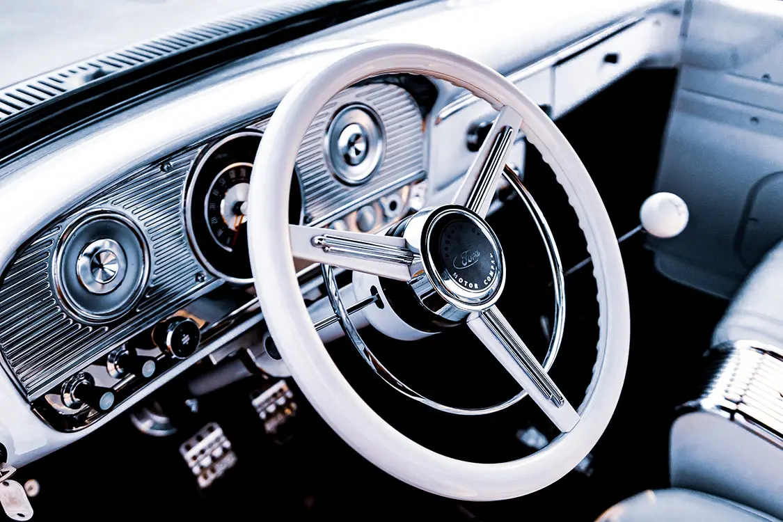 Although Shannon has an affinity for the look of natural patina, he wanted a much more polished atmosphere inside the cab. Dominic Olson at Big O Fabrications in Colorado Springs reworked a set of Ford Galaxie bucket seats and a center console from a Mercury Comet, and then finished them off in luxurious white leather and excellent stitchwork. Dakota Digital gauges, a Speedway Motors steering column and CON2R steering wheel all came together to upgrade the F-100’s cockpit while lending a clean vintage appearance to the command center. Shannon admits that the cab space is still a work in progress, but it has come a long way so far and will be heading further in the direction of providing a true VIP experience to its occupants.