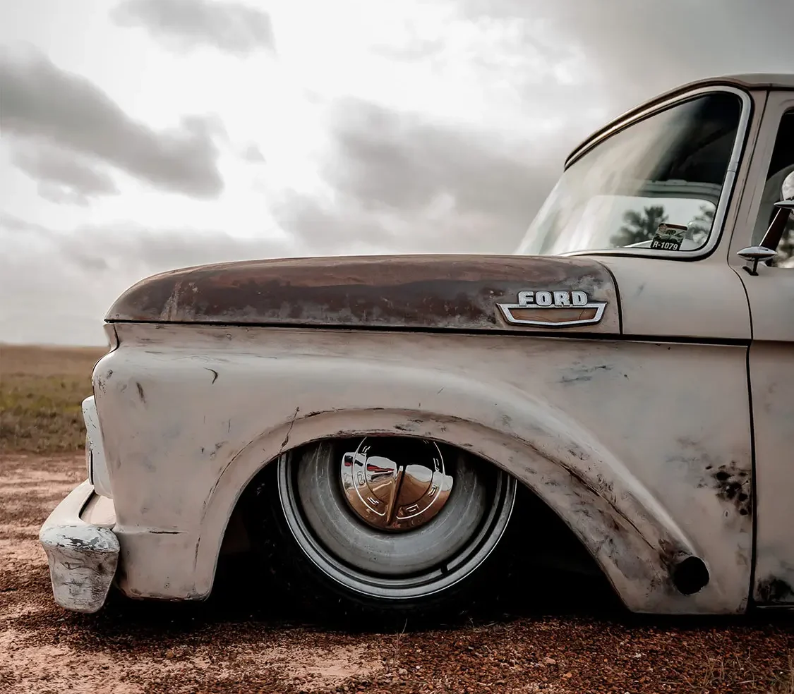 The truck has seen various ride height levels throughout the years, but to achieve its current stance, Shannon entrusted a Scott’s Hot Rods front suspension kit and an AVS rear 4-link setup to help provide a more aggressive altitude as well as an elevated ride quality than before. Full air ride allows for height adjustability to give the truck all the room it needs to fully function while in motion—plus, there’s nothing cooler than being able to air an old truck out on the ground. A tall rear frame notch had to be fabricated in order to fit the Ford 9-inch pumpkin, but Shannon made quick work of that before ordering the perfect set of wheels to blend in with the truck’s developing style.
