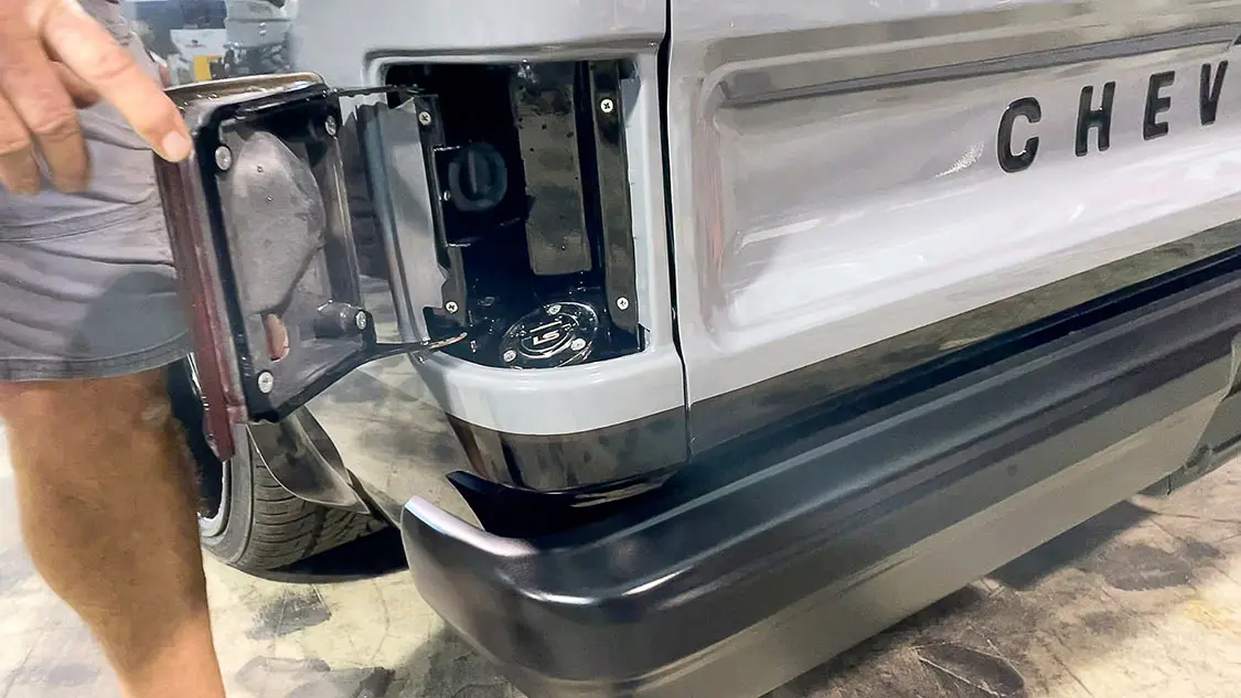 15. LS Fabrication’s custom gas door filler elegantly installed behind the driver’s side taillight of the Sergeant Square, debuted at SEMA Show 2023.