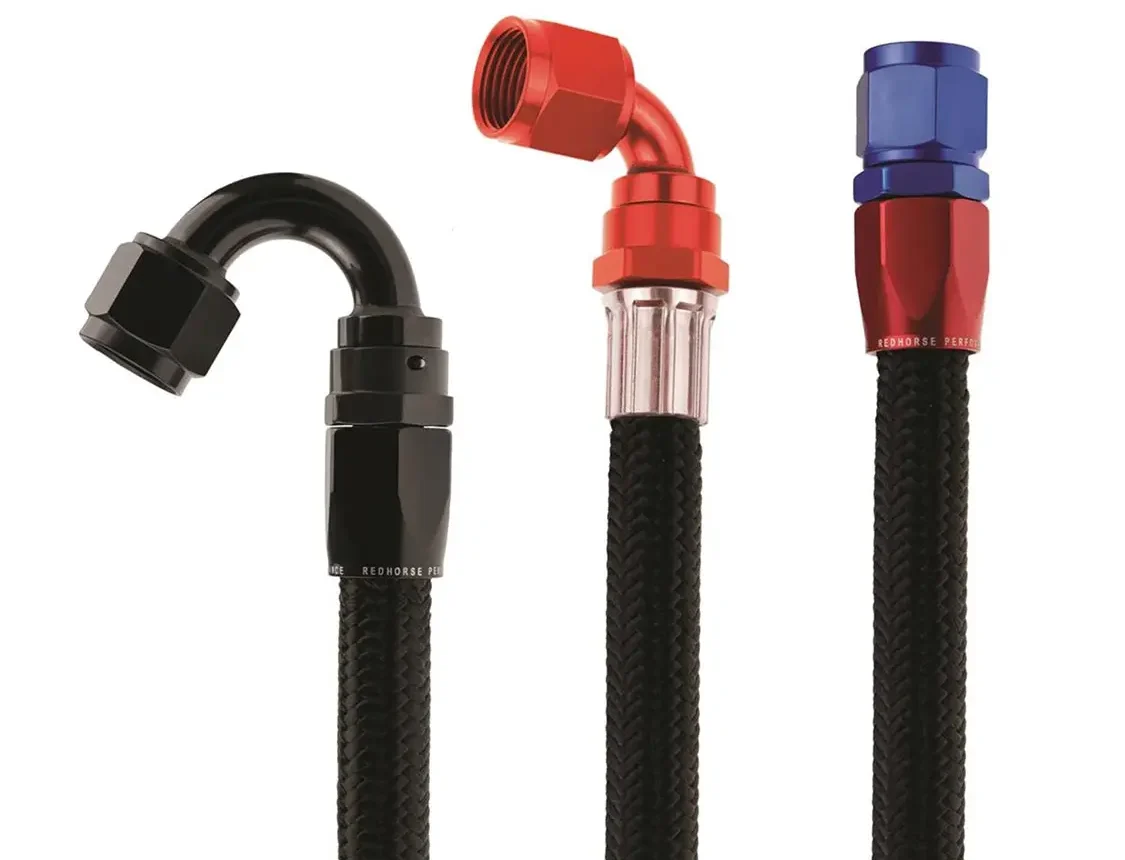 235 Series Premium Nylon Braided Hose and 205 Series Stainless Braided Hose have a dual-layer inner tube of Epichlorohydrin (ECO) and Fluoroelastomer that is compatible with E85, methanol, and gasoline. They also have a full stainless steel underbraid layer. The 235 Series Hose has a black braided nylon cover, and the 205 Series hose has a stainless steel braided cover.