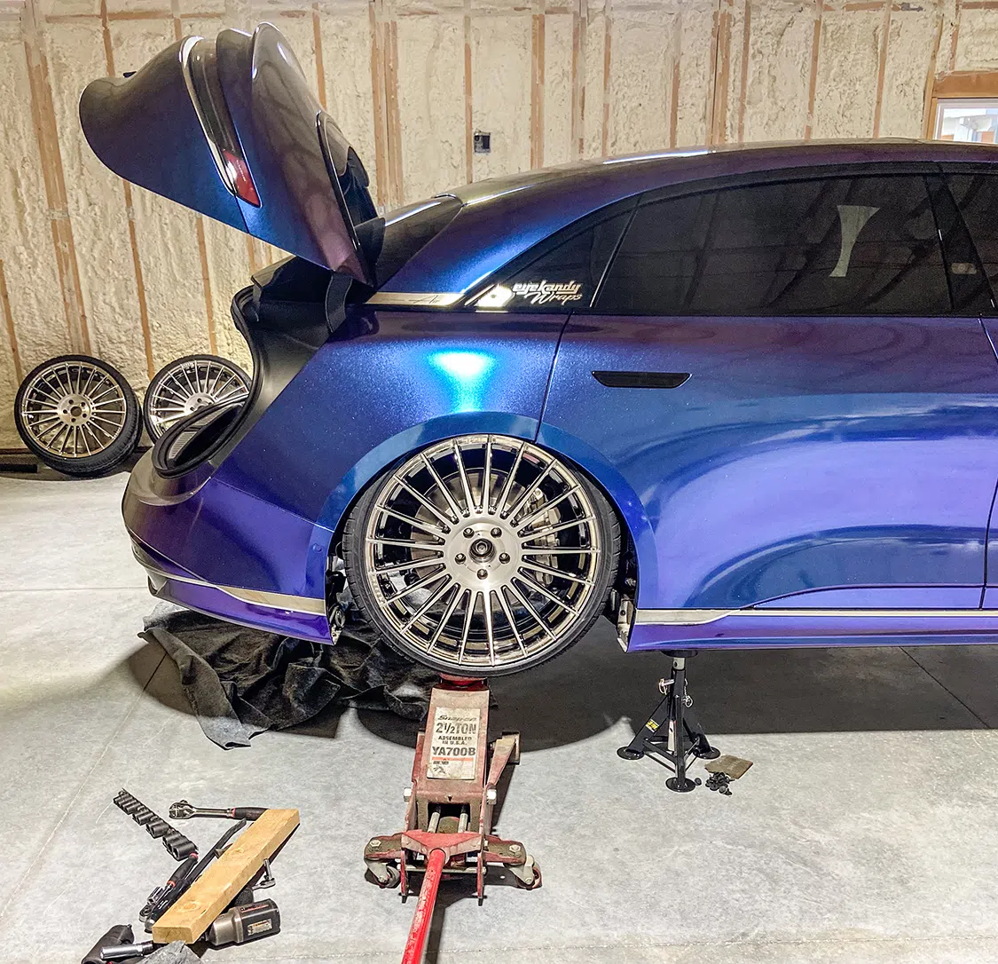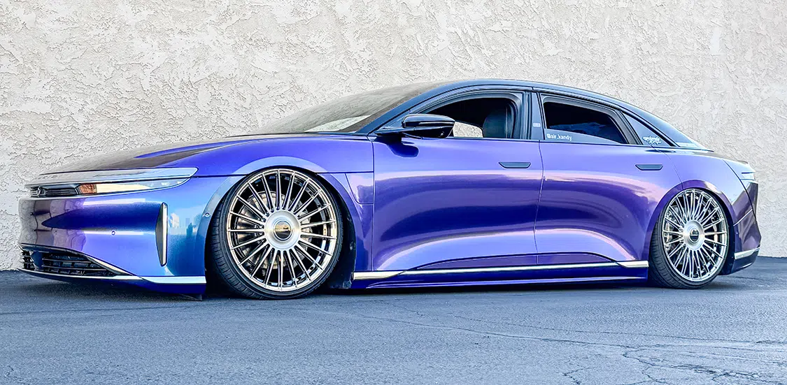 When it comes to the higher-end, more expensive electric vehicles, they usually come with upgraded suspension for optimal handling. For cars like this 2023 Lucid Air Touring owned by RJ Silva with Eye Kandy Designs, every option box was checked from the factory. RJ ordered this car to get the exact accessories he wanted, but one that didn’t come factory on the car was adjustable air suspension. While several of the Tesla electric vehicles have direct bolt-on air suspension, no one had attempted to swap out the stock Lucid suspension, which left RJ on the hunt to make it happen. RJ is no stranger to custom vehicles, as he has had past SEMA builds and works heavily in the aftermarket industry creating work for multiple companies. As soon as RJ took possession of the car, a plan to get the car as low as possible was set into motion. He reached out to Adam Madrigal at AMF Garage in Las Vegas to see if it was even possible to swap the factory suspension for air suspension. Once Adam was able to inspect the setup, they immediately started contacting companies to piece together the parts needed. At this point, the car had just acquired a SEMA ’23 booth spot and needed to have the suspension complete before the show, which was less than two months away.