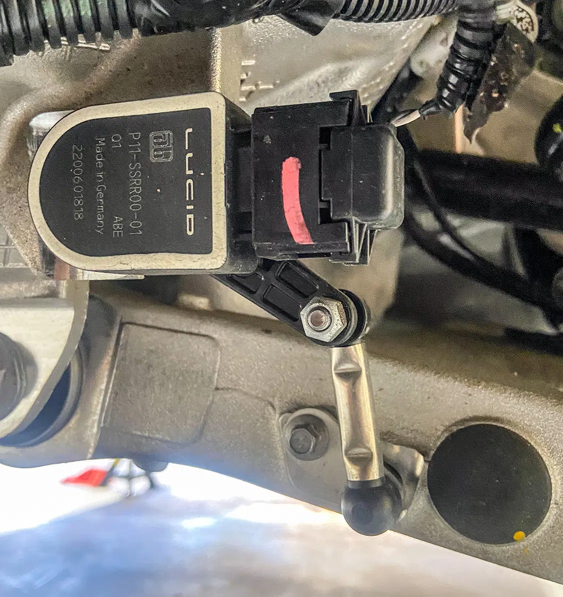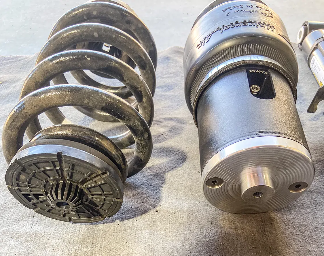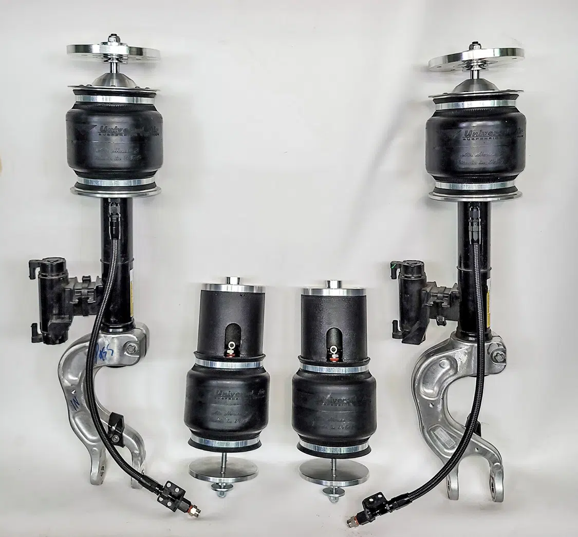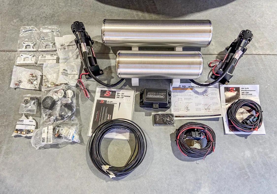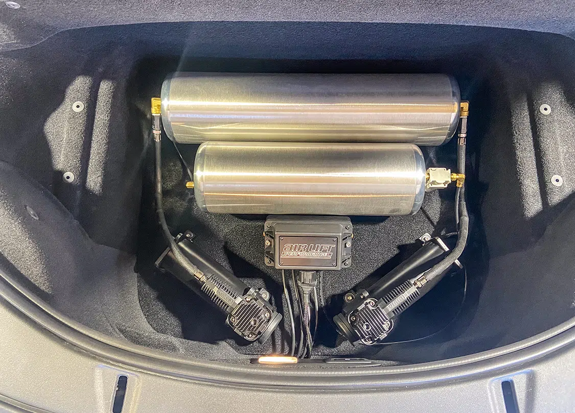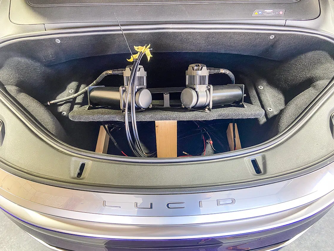 1. With all the air mangement parts laid out, a game plan could be made as far as mounting parts and running lines.2. The Lucid Air is equipped with adaptive suspension, which was unplugged from the front struts before they could be removed.3. The OEM front struts were removed and marked for the initial measurements for Universal Air to use to create the new air bag setup.4. The factory height sensor arms were disconnected to allow the suspension to come apart but was reinstalled with the new suspension and still works controlling the damping like it did from the factory.5. With the rear coil springs removed, you can see there is a pocket in the lower control arm where the spring sits with the lower spring cap. The rear doesn’t have struts like the front.6. The upper rear spring plate had a centering hole where the factory spring cap sat. This was important when getting the exact measurements for the new rear air bag brackets.7. The rear upper and lower spring caps have alignment pins that secure the springs to the car.8. With the car apart, it was time to ensure the new wheel and tire fitment would work with no issues. The factory tire was a 245/35-21 so bumping up to a 22-inch wheel, a 255/30-22 was the closest to the factory diameter to keep all the car’s advanced sensors performing correctly with the new setup.9. Universal Air machined upper and lower air bag mounts that include seals to slide over the factory front struts.9(A)10. The rear was different and Universal Air made upper and lower machined brackets and bag spacers to go along with the new air bags.11. With the new front and rear suspension components assembled, you can see where the front coil spring location now houses the air bag and the rear air bag assembly that replaces the rear springs.12. The factory rear spring and mounting plate on the left compared to the new air suspension on the right.13. The OEM parts that were removed from the stock front strut on the left vs the assembled air strut on the right. All mounting hardware fits in the factory locations just as it would stock.14. Before any air pressure was added to the new suspension, the new 22-inch Vossen wheels were bolted up and jacked into location to check for clearance. When prototyping a suspension like this, double checking fitment like this is crucial.14(A)15. The new front strut top plate has the same mounting holes as the factory one, which allows for direct fitment. The marked hole on each plate helped align the upper plate when reinstalling the front struts.15(A)16. The Lucid side skirts allow full access to run the air lines from the rear to the front so they can be connected to the Air Lift 3P manifold. It is recommended to use ¼-inch air line with this car due to limited space to run the lines.17. To get better access to mounting points in the fender wells and under the car, the wheelwell liners and rear under carriage trays were removed. This not only allows for easier access, but once reinstalled, provides protection for the air lines.18. When running air lines, keep them tucked away from any moving parts. The easiest thing to do is to run them alongside factory wiring or brake lines.19. Once the air lines and the wiring harness was run to the front of the car, finding the perfect hole to route them through can be tough on a double insulated car like the Lucid Air. But with a pick, Adam made sure the hole he wanted to use would work.20. The wiring harness and air lines were routed into the frunk, which provides plenty of room for the air management.21. For the Lucid Air, the 12-volt power for the air management was tricky to find due to it not being like most vehicles, but the electric panel on the passenger side kick panel allowed for the perfect connection.22. With the air management ready to go in and the hard parts installed, the air lines could be connected to the front struts and rear bags. Adam likes to run the four corners to shop ball valves and leave aired up overnight to check for leaks. This makes chasing down a leak once it’s 100% installed easier, because you can eliminate where it’s coming from with this one step.22(A)23. The compressors, air tanks, and manifold mount were laid out on the mounting board to figure out the best fitment for all the parts. Once the locations were determined, the holes were drilled.24. Tee nuts were placed into the bottom side of the holes to allow for not only easier assembly, but also easier repairs if needed down the road.25. Once the air management plate was assembled, it was set into the frunk, wired, and connected to air lines.26. The installed air management plate fit nicely into the frunk and has a clean, OEM+ look to it. The factory mid panel still fits and the frunk can still be used as intended from the factory.26(A)