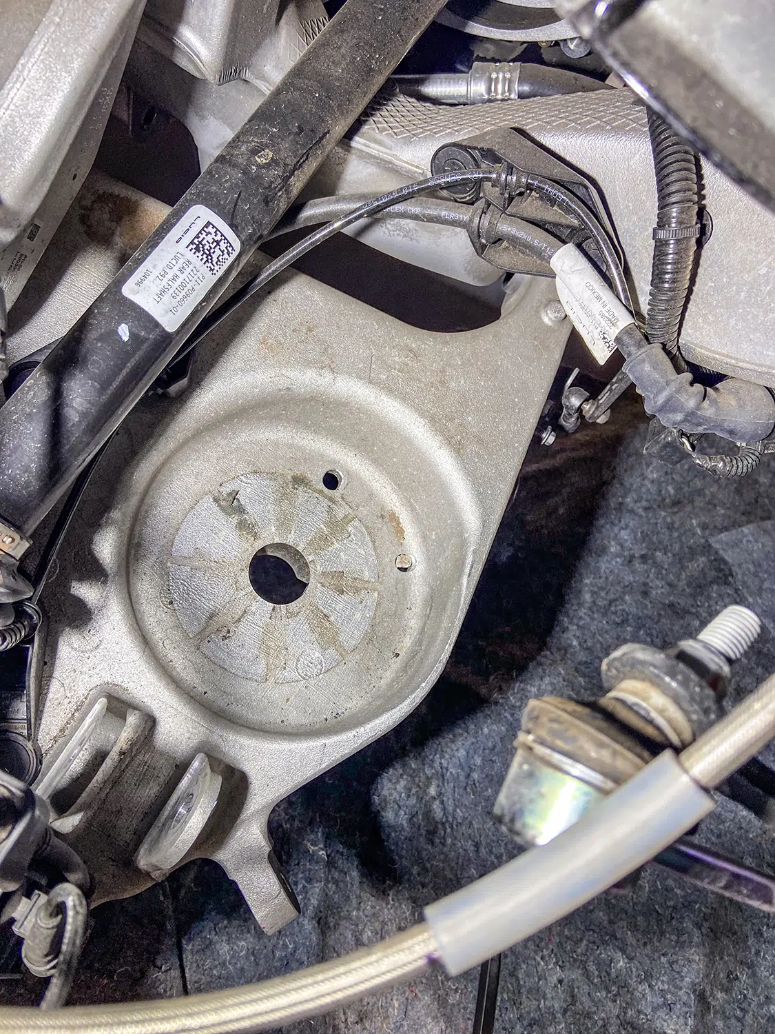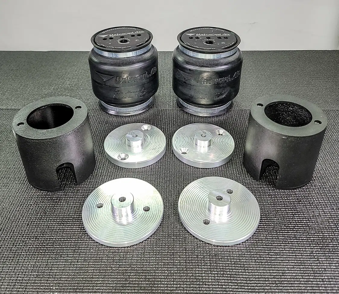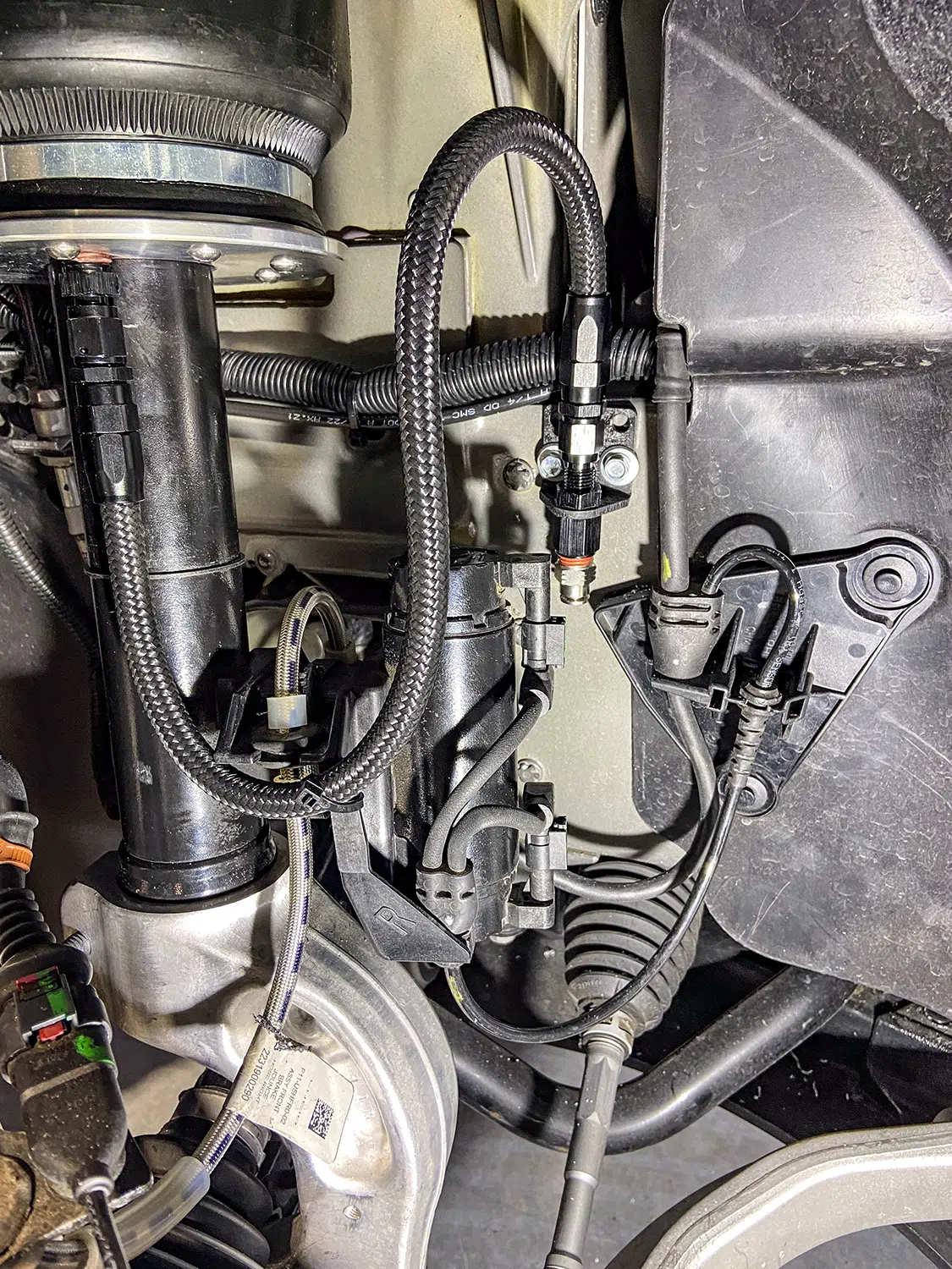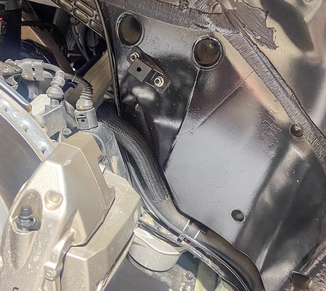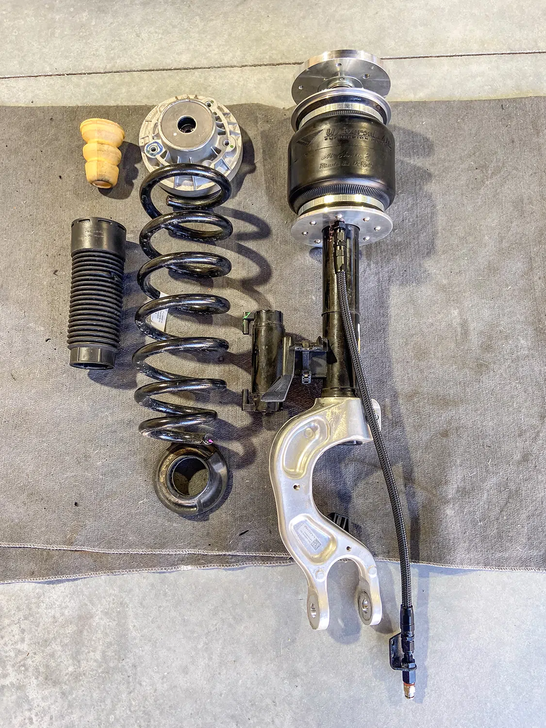 1. With all the air mangement parts laid out, a game plan could be made as far as mounting parts and running lines.2. The Lucid Air is equipped with adaptive suspension, which was unplugged from the front struts before they could be removed.3. The OEM front struts were removed and marked for the initial measurements for Universal Air to use to create the new air bag setup.4. The factory height sensor arms were disconnected to allow the suspension to come apart but was reinstalled with the new suspension and still works controlling the damping like it did from the factory.5. With the rear coil springs removed, you can see there is a pocket in the lower control arm where the spring sits with the lower spring cap. The rear doesn’t have struts like the front.6. The upper rear spring plate had a centering hole where the factory spring cap sat. This was important when getting the exact measurements for the new rear air bag brackets.7. The rear upper and lower spring caps have alignment pins that secure the springs to the car.8. With the car apart, it was time to ensure the new wheel and tire fitment would work with no issues. The factory tire was a 245/35-21 so bumping up to a 22-inch wheel, a 255/30-22 was the closest to the factory diameter to keep all the car’s advanced sensors performing correctly with the new setup.9. Universal Air machined upper and lower air bag mounts that include seals to slide over the factory front struts.9(A)10. The rear was different and Universal Air made upper and lower machined brackets and bag spacers to go along with the new air bags.11. With the new front and rear suspension components assembled, you can see where the front coil spring location now houses the air bag and the rear air bag assembly that replaces the rear springs.12. The factory rear spring and mounting plate on the left compared to the new air suspension on the right.13. The OEM parts that were removed from the stock front strut on the left vs the assembled air strut on the right. All mounting hardware fits in the factory locations just as it would stock.14. Before any air pressure was added to the new suspension, the new 22-inch Vossen wheels were bolted up and jacked into location to check for clearance. When prototyping a suspension like this, double checking fitment like this is crucial.14(A)15. The new front strut top plate has the same mounting holes as the factory one, which allows for direct fitment. The marked hole on each plate helped align the upper plate when reinstalling the front struts.15(A)16. The Lucid side skirts allow full access to run the air lines from the rear to the front so they can be connected to the Air Lift 3P manifold. It is recommended to use ¼-inch air line with this car due to limited space to run the lines.17. To get better access to mounting points in the fender wells and under the car, the wheelwell liners and rear under carriage trays were removed. This not only allows for easier access, but once reinstalled, provides protection for the air lines.18. When running air lines, keep them tucked away from any moving parts. The easiest thing to do is to run them alongside factory wiring or brake lines.19. Once the air lines and the wiring harness was run to the front of the car, finding the perfect hole to route them through can be tough on a double insulated car like the Lucid Air. But with a pick, Adam made sure the hole he wanted to use would work.20. The wiring harness and air lines were routed into the frunk, which provides plenty of room for the air management.21. For the Lucid Air, the 12-volt power for the air management was tricky to find due to it not being like most vehicles, but the electric panel on the passenger side kick panel allowed for the perfect connection.22. With the air management ready to go in and the hard parts installed, the air lines could be connected to the front struts and rear bags. Adam likes to run the four corners to shop ball valves and leave aired up overnight to check for leaks. This makes chasing down a leak once it’s 100% installed easier, because you can eliminate where it’s coming from with this one step.22(A)23. The compressors, air tanks, and manifold mount were laid out on the mounting board to figure out the best fitment for all the parts. Once the locations were determined, the holes were drilled.24. Tee nuts were placed into the bottom side of the holes to allow for not only easier assembly, but also easier repairs if needed down the road.25. Once the air management plate was assembled, it was set into the frunk, wired, and connected to air lines.26. The installed air management plate fit nicely into the frunk and has a clean, OEM+ look to it. The factory mid panel still fits and the frunk can still be used as intended from the factory.26(A)