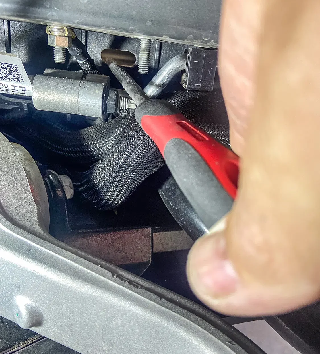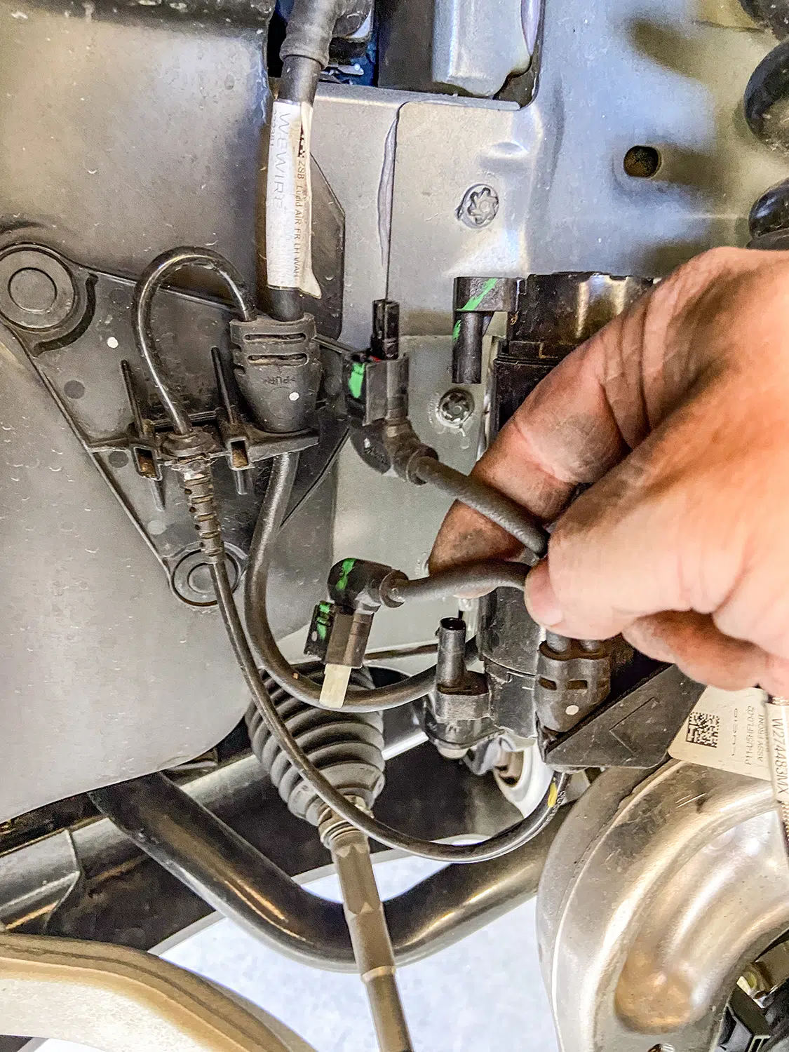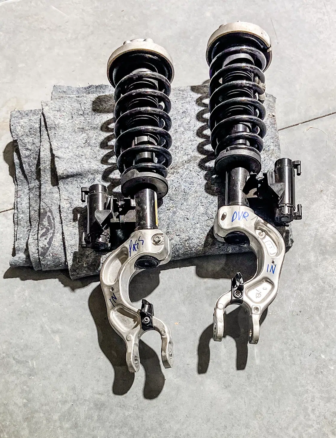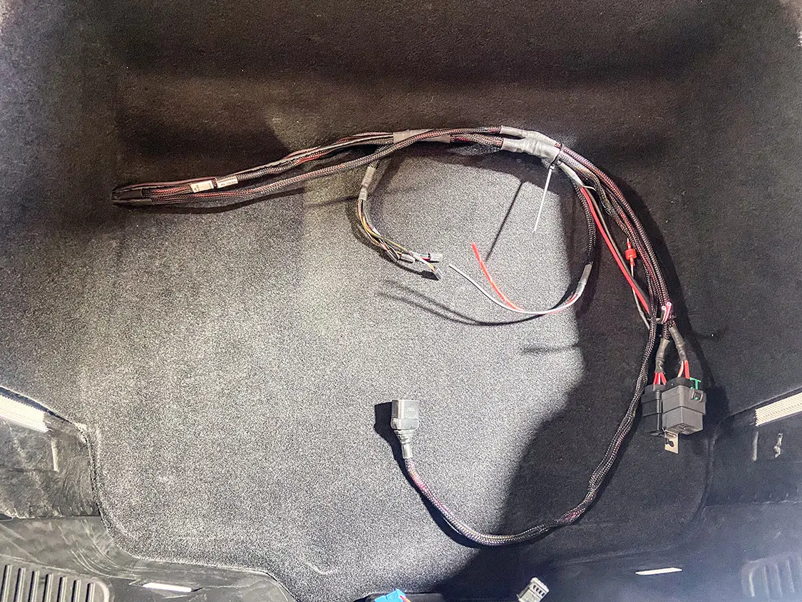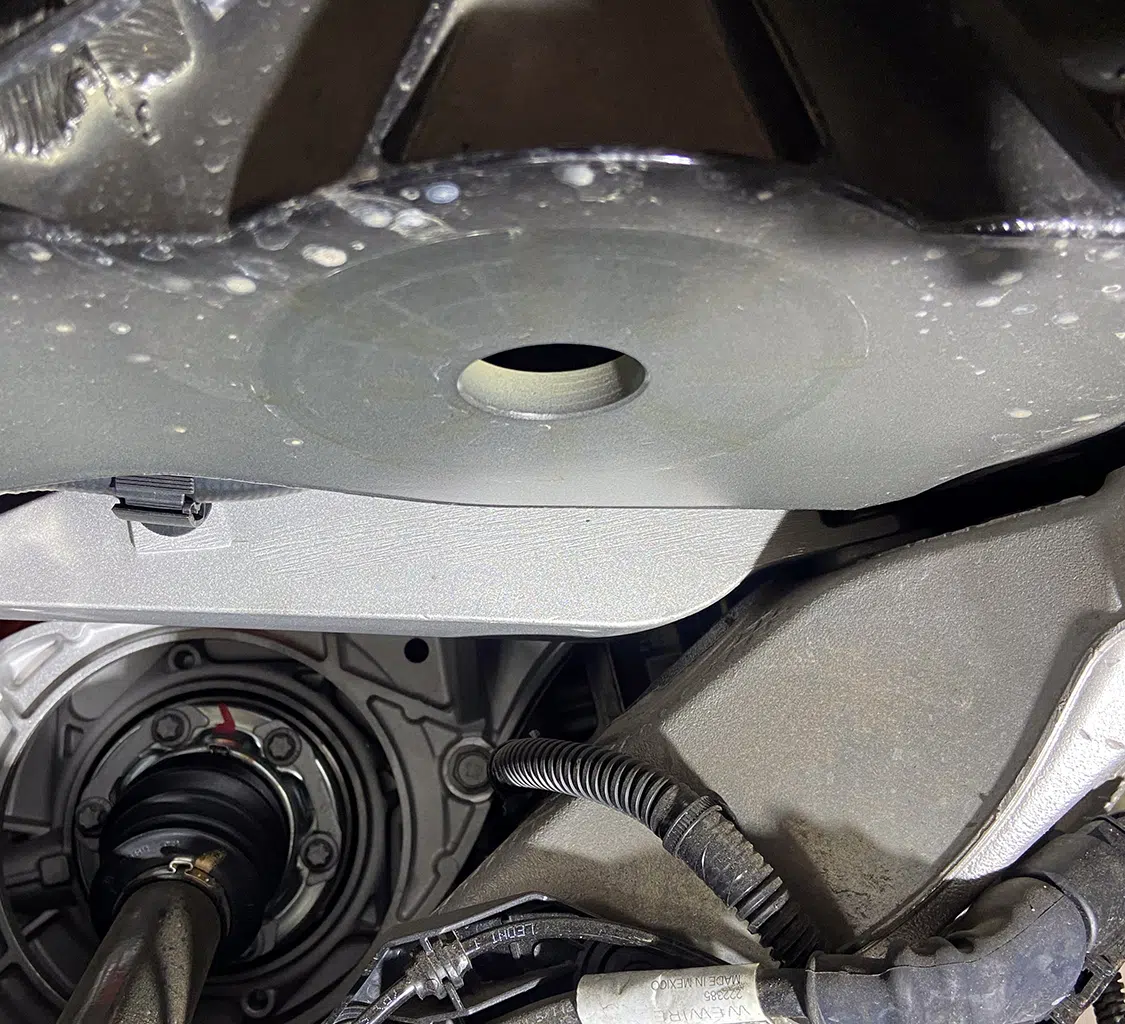 1. With all the air mangement parts laid out, a game plan could be made as far as mounting parts and running lines.2. The Lucid Air is equipped with adaptive suspension, which was unplugged from the front struts before they could be removed.3. The OEM front struts were removed and marked for the initial measurements for Universal Air to use to create the new air bag setup.4. The factory height sensor arms were disconnected to allow the suspension to come apart but was reinstalled with the new suspension and still works controlling the damping like it did from the factory.5. With the rear coil springs removed, you can see there is a pocket in the lower control arm where the spring sits with the lower spring cap. The rear doesn’t have struts like the front.6. The upper rear spring plate had a centering hole where the factory spring cap sat. This was important when getting the exact measurements for the new rear air bag brackets.7. The rear upper and lower spring caps have alignment pins that secure the springs to the car.8. With the car apart, it was time to ensure the new wheel and tire fitment would work with no issues. The factory tire was a 245/35-21 so bumping up to a 22-inch wheel, a 255/30-22 was the closest to the factory diameter to keep all the car’s advanced sensors performing correctly with the new setup.9. Universal Air machined upper and lower air bag mounts that include seals to slide over the factory front struts.9(A)10. The rear was different and Universal Air made upper and lower machined brackets and bag spacers to go along with the new air bags.11. With the new front and rear suspension components assembled, you can see where the front coil spring location now houses the air bag and the rear air bag assembly that replaces the rear springs.12. The factory rear spring and mounting plate on the left compared to the new air suspension on the right.13. The OEM parts that were removed from the stock front strut on the left vs the assembled air strut on the right. All mounting hardware fits in the factory locations just as it would stock.14. Before any air pressure was added to the new suspension, the new 22-inch Vossen wheels were bolted up and jacked into location to check for clearance. When prototyping a suspension like this, double checking fitment like this is crucial.14(A)15. The new front strut top plate has the same mounting holes as the factory one, which allows for direct fitment. The marked hole on each plate helped align the upper plate when reinstalling the front struts.15(A)16. The Lucid side skirts allow full access to run the air lines from the rear to the front so they can be connected to the Air Lift 3P manifold. It is recommended to use ¼-inch air line with this car due to limited space to run the lines.17. To get better access to mounting points in the fender wells and under the car, the wheelwell liners and rear under carriage trays were removed. This not only allows for easier access, but once reinstalled, provides protection for the air lines.18. When running air lines, keep them tucked away from any moving parts. The easiest thing to do is to run them alongside factory wiring or brake lines.19. Once the air lines and the wiring harness was run to the front of the car, finding the perfect hole to route them through can be tough on a double insulated car like the Lucid Air. But with a pick, Adam made sure the hole he wanted to use would work.20. The wiring harness and air lines were routed into the frunk, which provides plenty of room for the air management.21. For the Lucid Air, the 12-volt power for the air management was tricky to find due to it not being like most vehicles, but the electric panel on the passenger side kick panel allowed for the perfect connection.22. With the air management ready to go in and the hard parts installed, the air lines could be connected to the front struts and rear bags. Adam likes to run the four corners to shop ball valves and leave aired up overnight to check for leaks. This makes chasing down a leak once it’s 100% installed easier, because you can eliminate where it’s coming from with this one step.22(A)23. The compressors, air tanks, and manifold mount were laid out on the mounting board to figure out the best fitment for all the parts. Once the locations were determined, the holes were drilled.24. Tee nuts were placed into the bottom side of the holes to allow for not only easier assembly, but also easier repairs if needed down the road.25. Once the air management plate was assembled, it was set into the frunk, wired, and connected to air lines.26. The installed air management plate fit nicely into the frunk and has a clean, OEM+ look to it. The factory mid panel still fits and the frunk can still be used as intended from the factory.26(A)