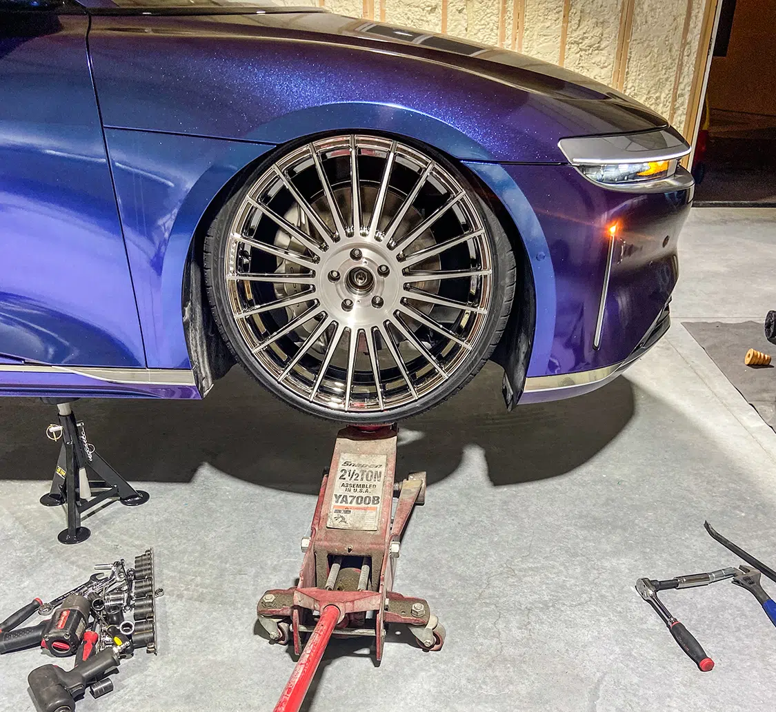RJ got with Air Lift Performance and ordered the air management needed to control the new suspension height options. He started with two Viair 444 compressors (P/N: 44442 with a $350 retail), a 24-inch FLO air tank (P/N: 15224 with a $320 retail), an 18-inch FLO air tank (P/N: 15218 with a $305 retail) and the Air Lift 3P manifold (P/N: 27780 with a $1,595 retail). That handled the controlling of the suspension, so now for the fun part, trying to get the struts figured out. After a call to Universal Air, they said they would handle designing and cutting the correct strut mounts and front bags as well as the mounts for the rear bags and once they finalized it, it would be a standard kit they offer with a $1,876 retail price. Now that the suspension components were enroute, a new set of wheels and tires was needed to complete the desired look. For this, Vossen Wheels stepped in to provide the 22-inch HF-8 wheels and Lexani Tire supplied the 255/30-22 tires. Being this is the first bagged Lucid Air, a lot of measuring and double-checking specs was required to make sure all of this was going to work together.