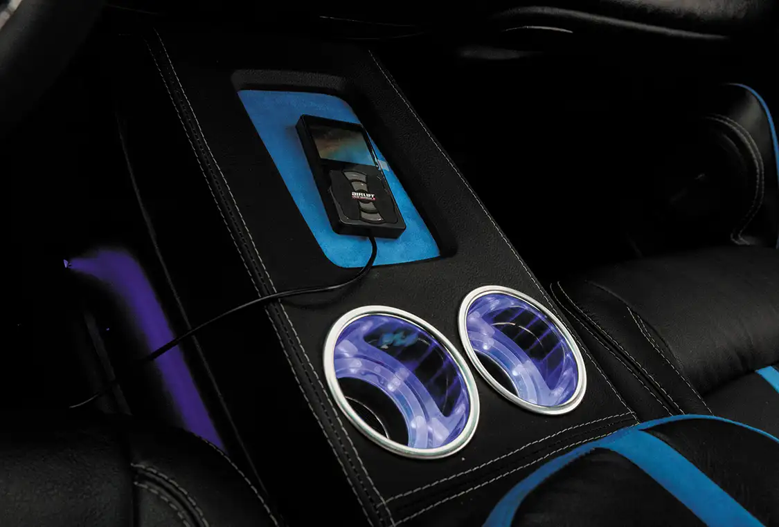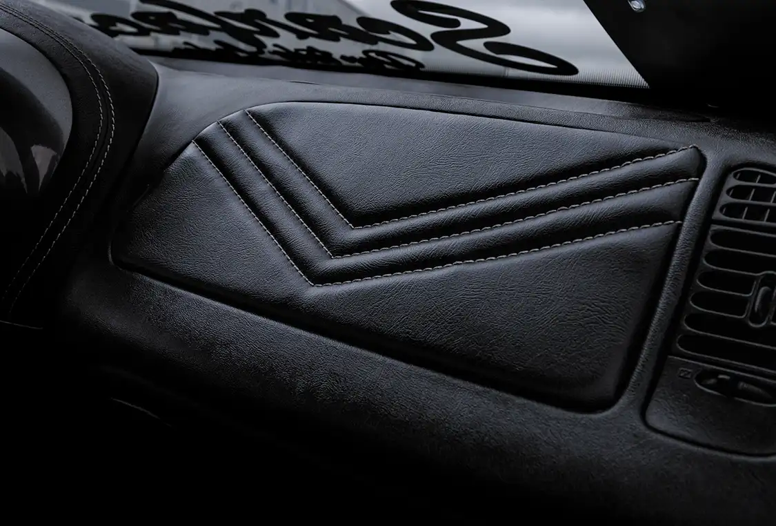Stepping inside, the interior reflects Ruben’s impeccable taste, featuring custom upholstery and a bespoke center console. The sound system, powered by Alpine, ensures that you can hear Ruben’s arrival from blocks away.