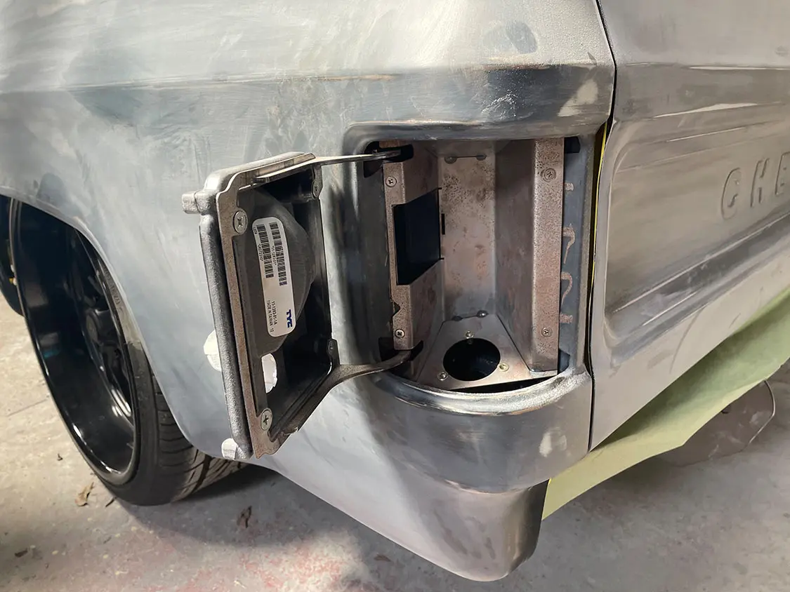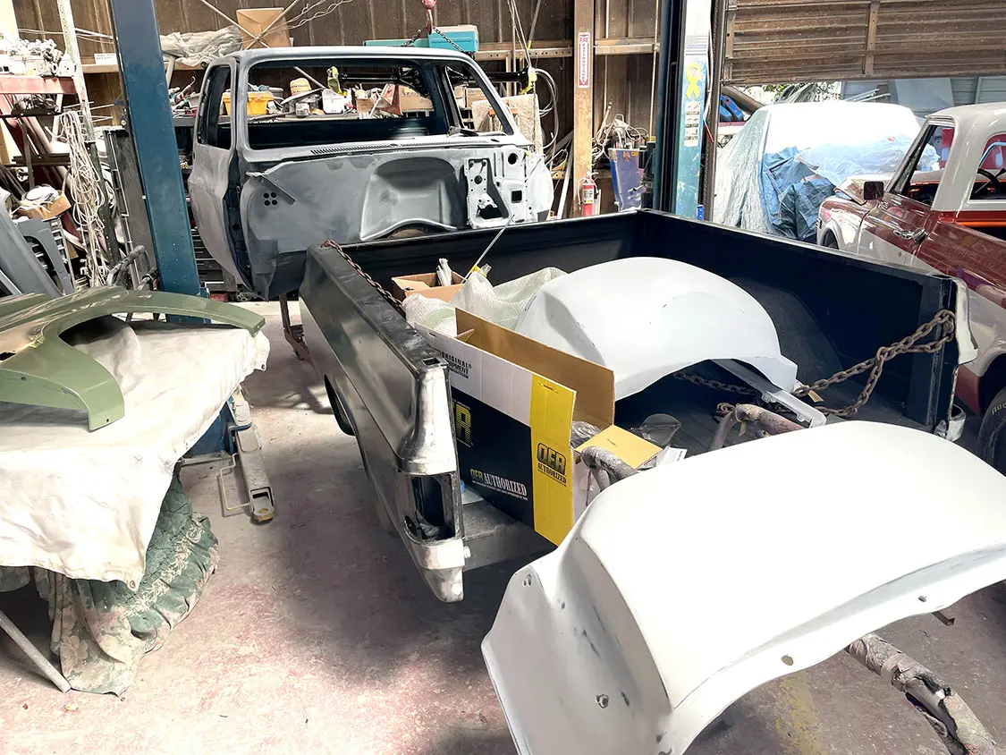 After careful assembly and fitment of our new American Chassis frame and LMC Truck body panels, Sergeant Square is really taking shape. The project reached a pivotal moment as it was left to the skilled hands of Shane Murphy and Dack at Street Dreams Paint and Body Shop. There, the truck underwent a final disassembly, preparing it for the transformative stages of paint and graphics.