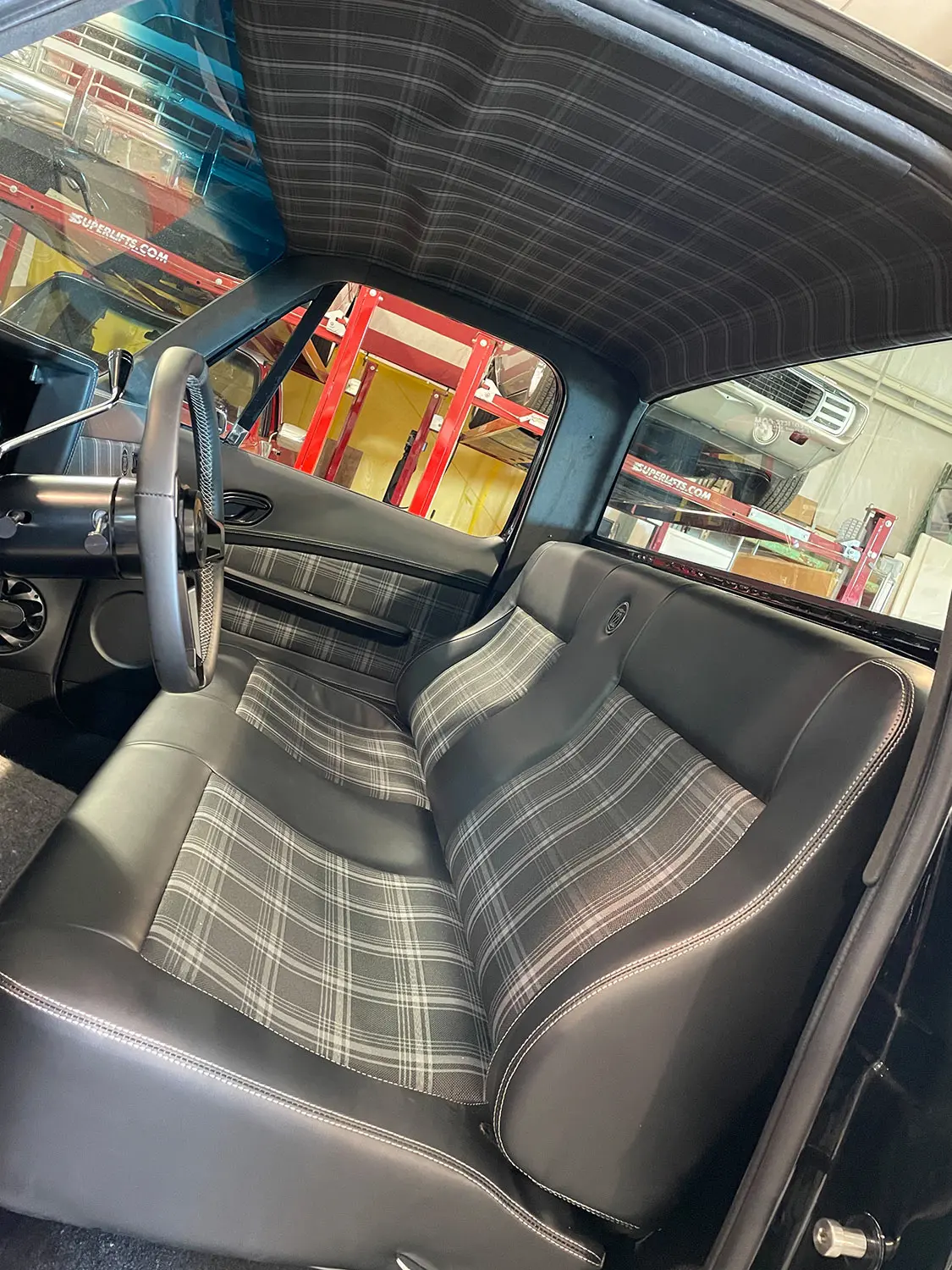 Inside, Fesler USA’s new interior components were installed, elevating the cab to a realm of luxury and comfort. This included a new filberglass dashpad, doorpanels, headliner and custom bench seat. The black leather, fixed with gray plaid pattern, is a perfect touch.