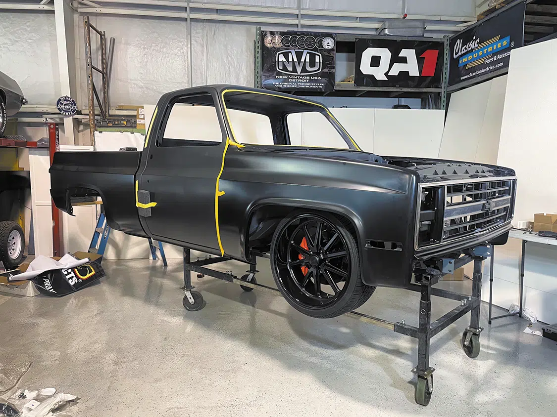 The 1985 Chevy Squarebody before additional upgrades. The rearend is yet to be installed, and the bed is partially assembled, leaving room for further customization.