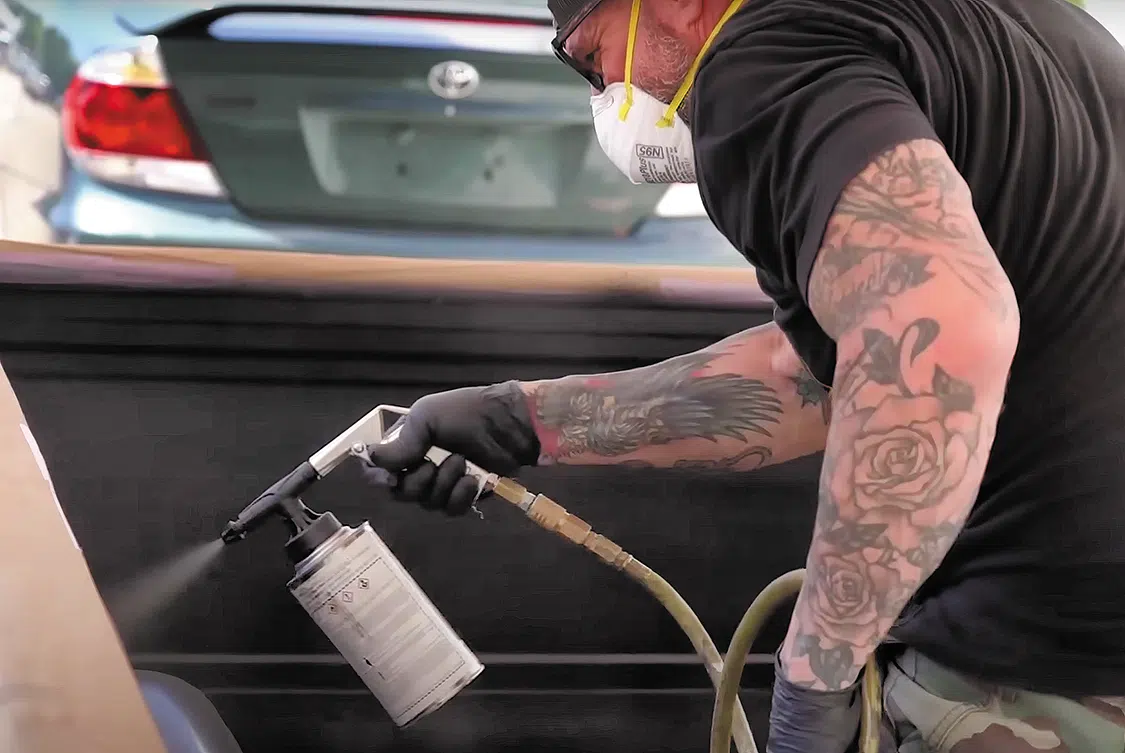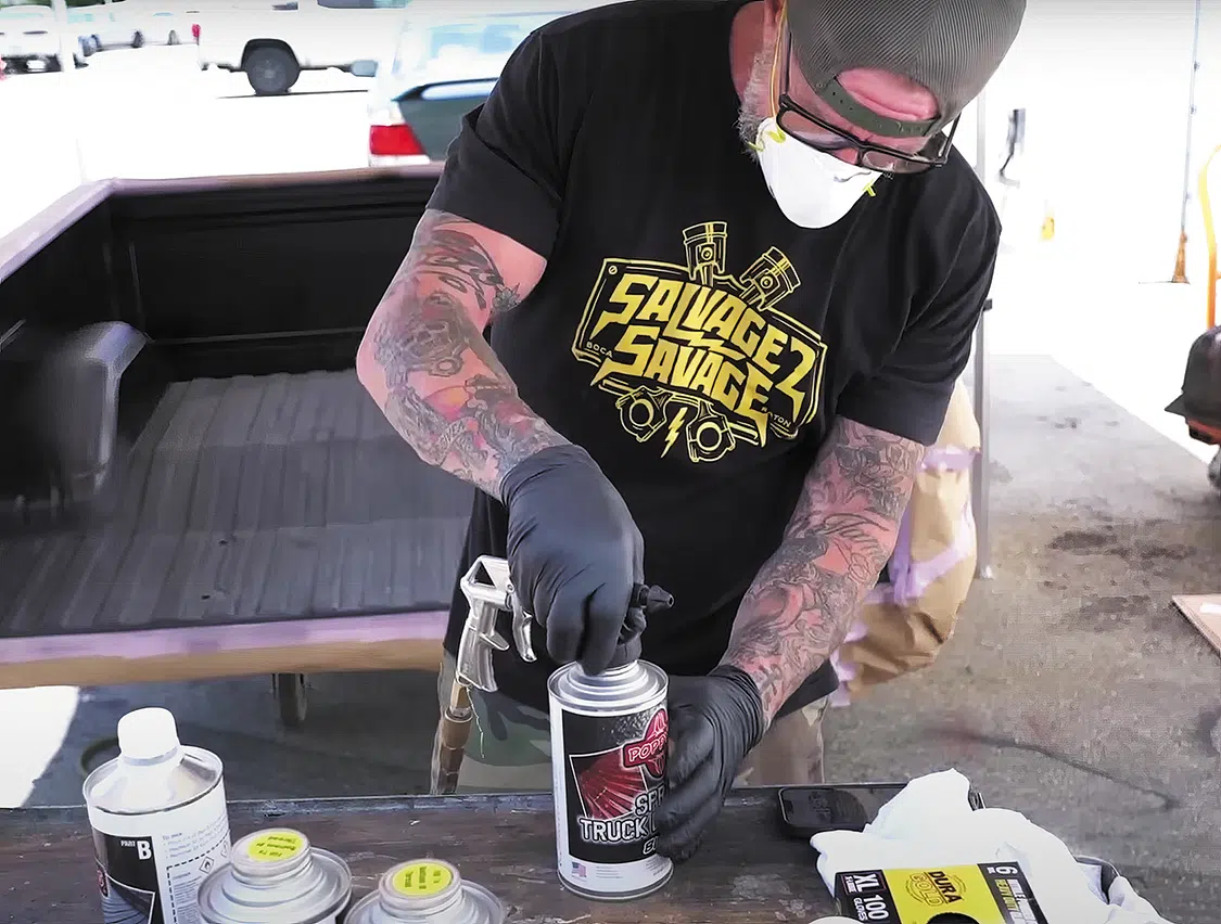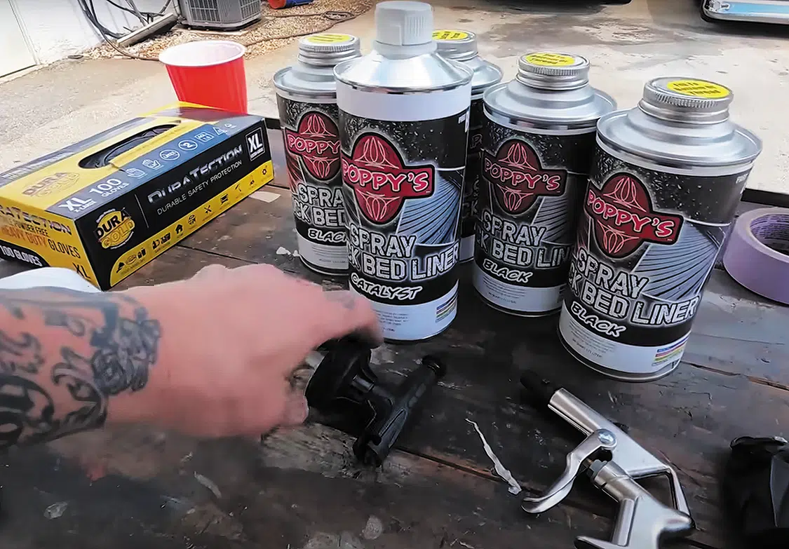 To cover the welds, Mickey sprayed a coating of Poppy’s Spray Truck Bedliner (Black). This stuff is a versatile and reliable solution that safeguards against rust, corrosion, salt, dampness, and extreme temperatures. With easy application and excellent adhesion, this kit includes everything you need for a professional-grade bedliner, including four cans of bedliner (Part A), one bed liner catalyst (Part B, 4-quart kit), and a convenient spray gun.