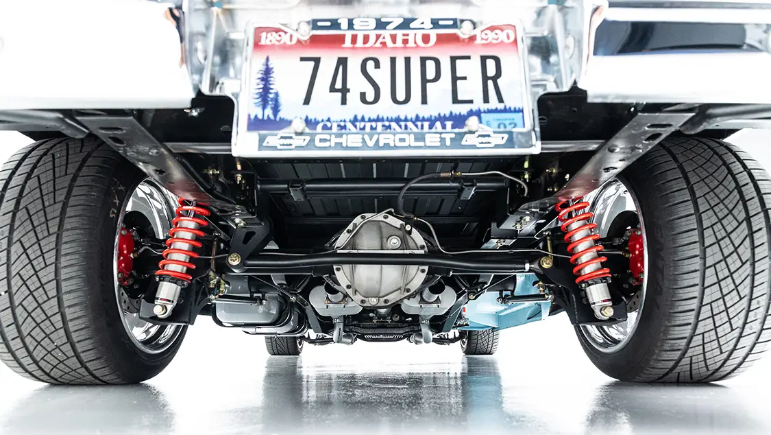 Underneath, this C10 rides like no ‘74 ever did. The stock GM frame got a full Ridetech coilover suspension system upgrade from Byron himself. Front to back, it’s all Ridetech—springs, shocks, control arms—you name it. It steers with a stock GM box, beefed up with Ridetech’s steering stabilizer, and stops on a dime thanks to Wilwood 6-piston front and 4-piston rear brakes, slotted rotors, and a Wilwood master.