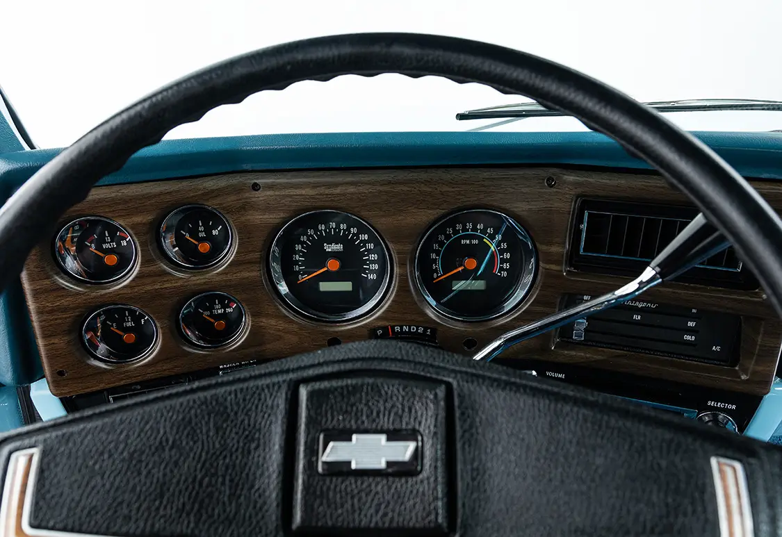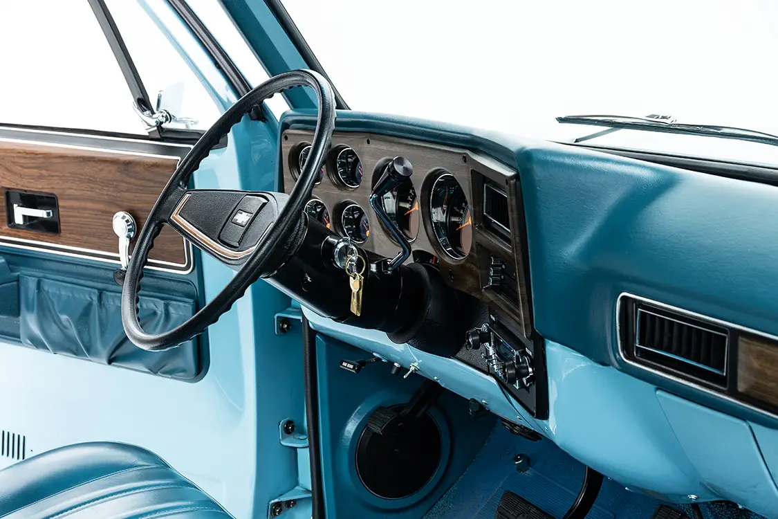 The outside stays true to its roots—GM factory light blue and white shot by Derek Greenhaughl in Rexburg. The paint is nothing wild, but is slick, straight, and sharp as could be. An Engineered Vintage polished aluminum grille, stock Sylvania headlights, and LMC bumpers give the C10 that period-perfect look. Inside, it’s all about keeping things clean and functional. Factory GM bucket seats, redone by Ben Upholstery in Idaho Falls, are wrapped in slate blue vinyl to match the era. A set of Dakota Digital VHX gauges update the info center, and thumpin’ tunes are delivered from a hidden system. There’s a Custom Autosound radio up front, a Slosh Tubz sub box out back, and Vintage Air tucked under the dash, giving Byron show truck comfort without losing its old-school charm.