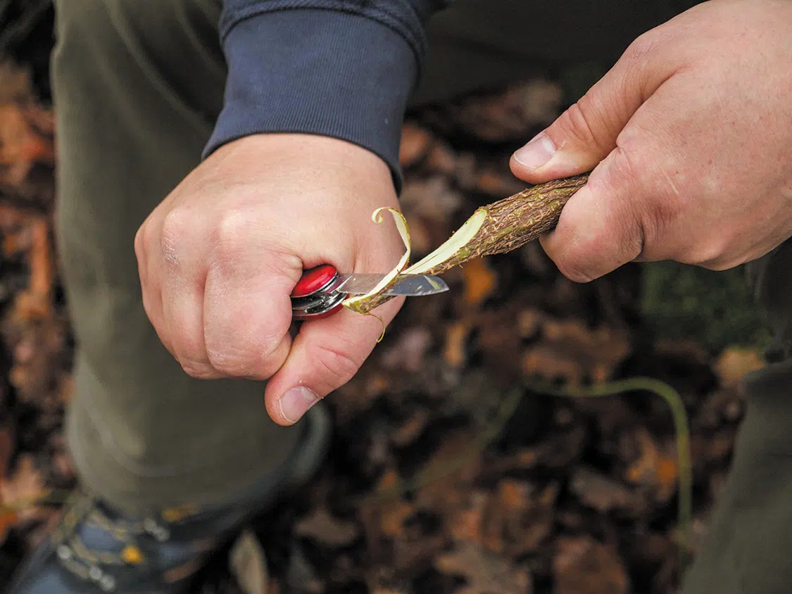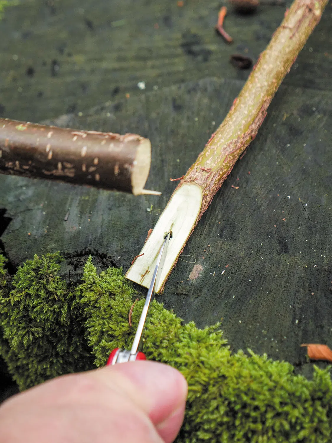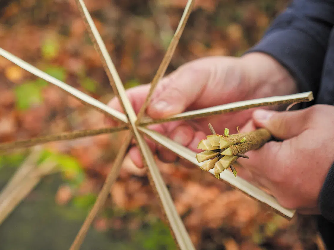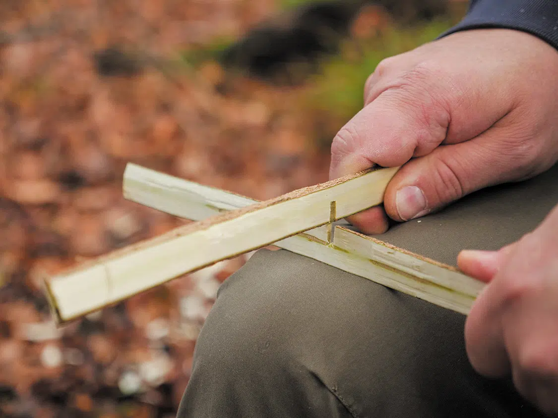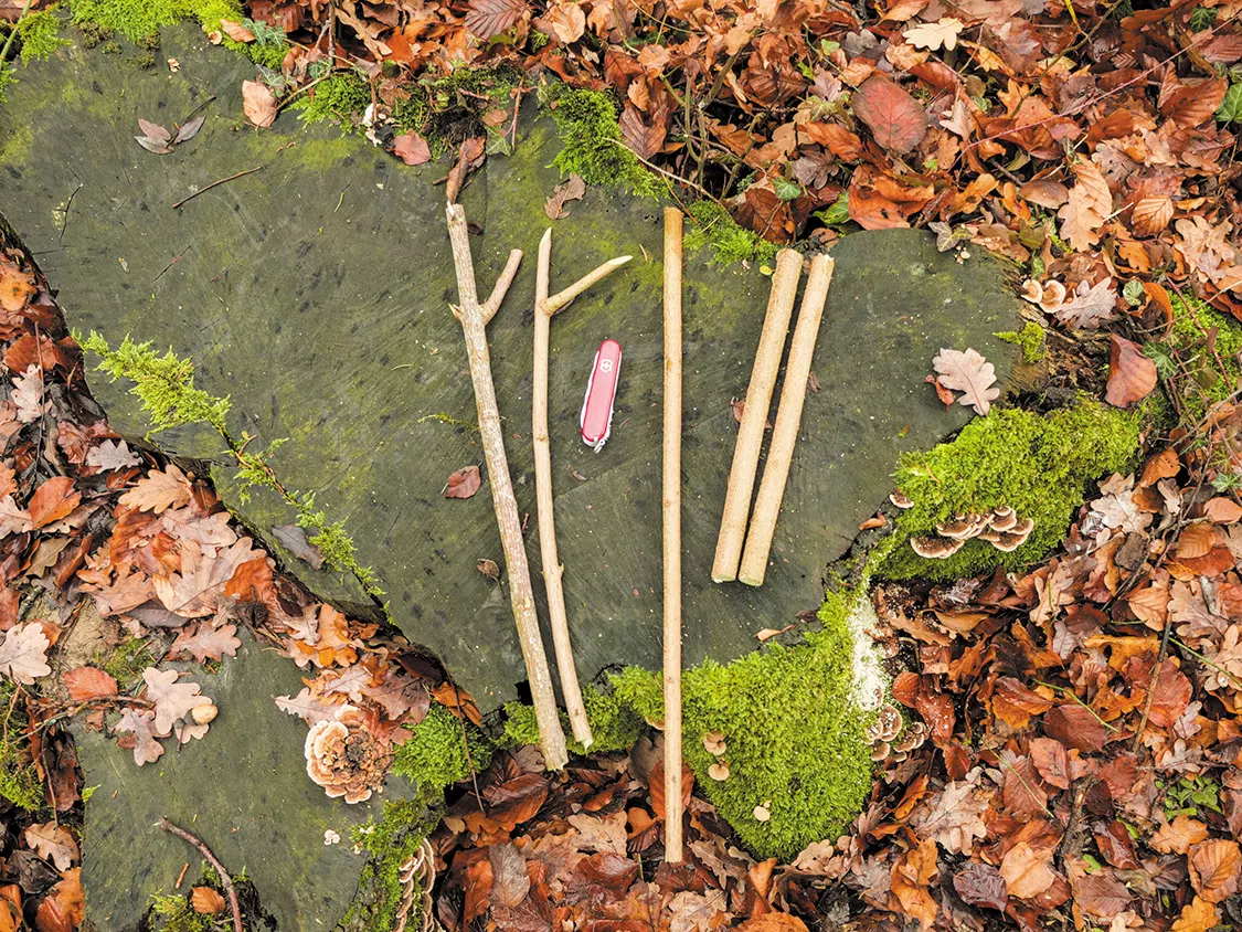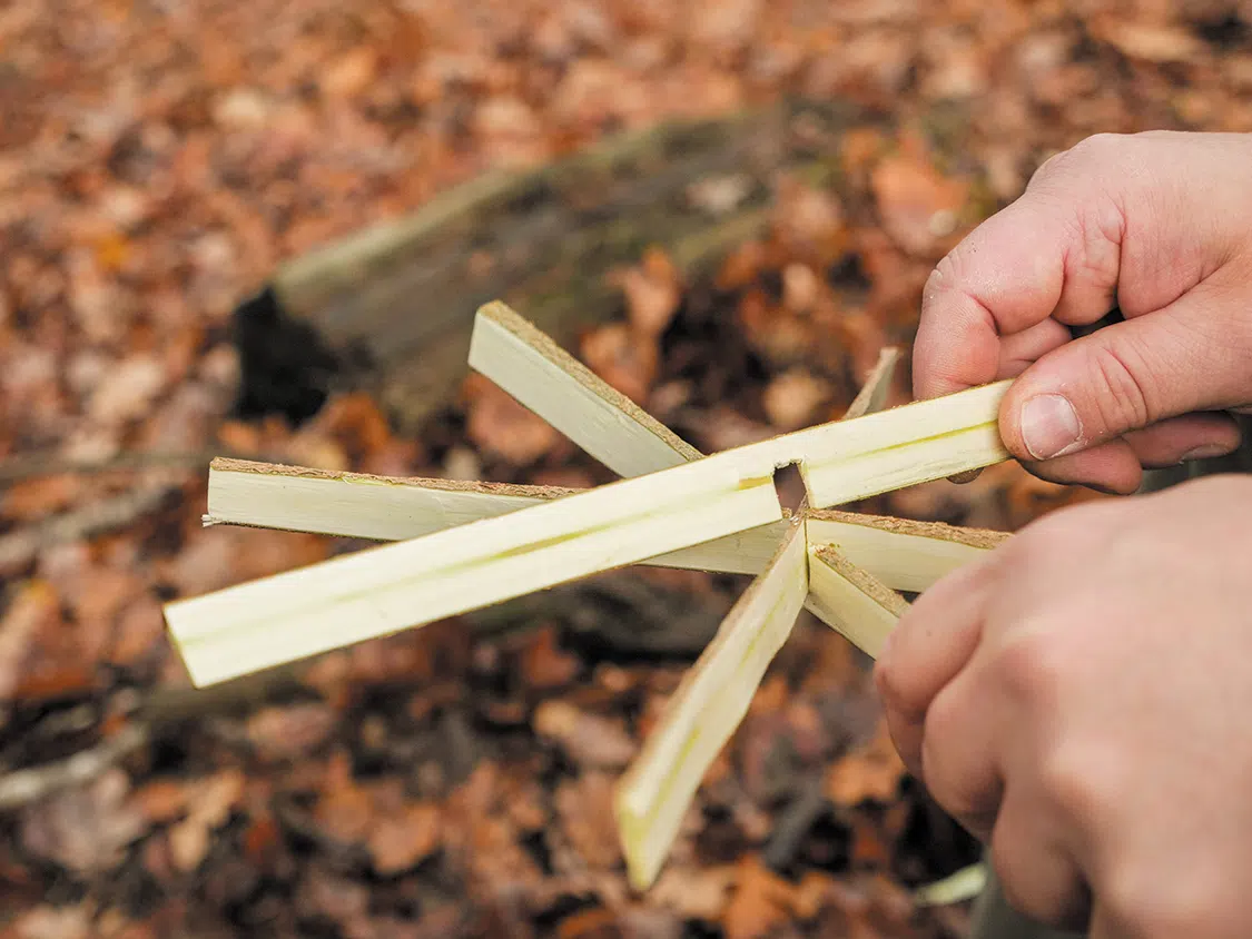 First, split the two branches for the shovel boards lengthwise (picture B). Carve away material on the second, round side until you have four boards with a thickness of about ¼ inch (5 mm). Then draw the center on all the boards. Now saw an approximately ¼ inch (5 mm) wide recess in two parts up to the center and insert the two parts into each other to form a cross (picture C).