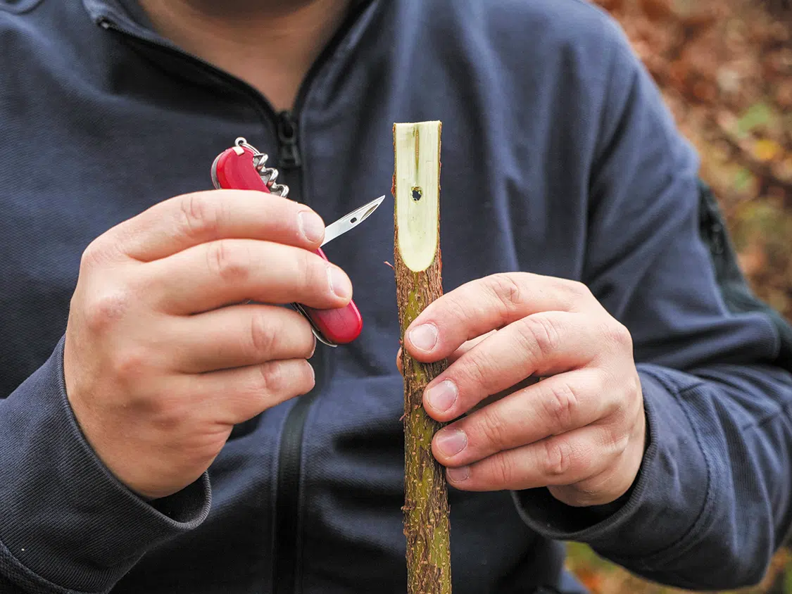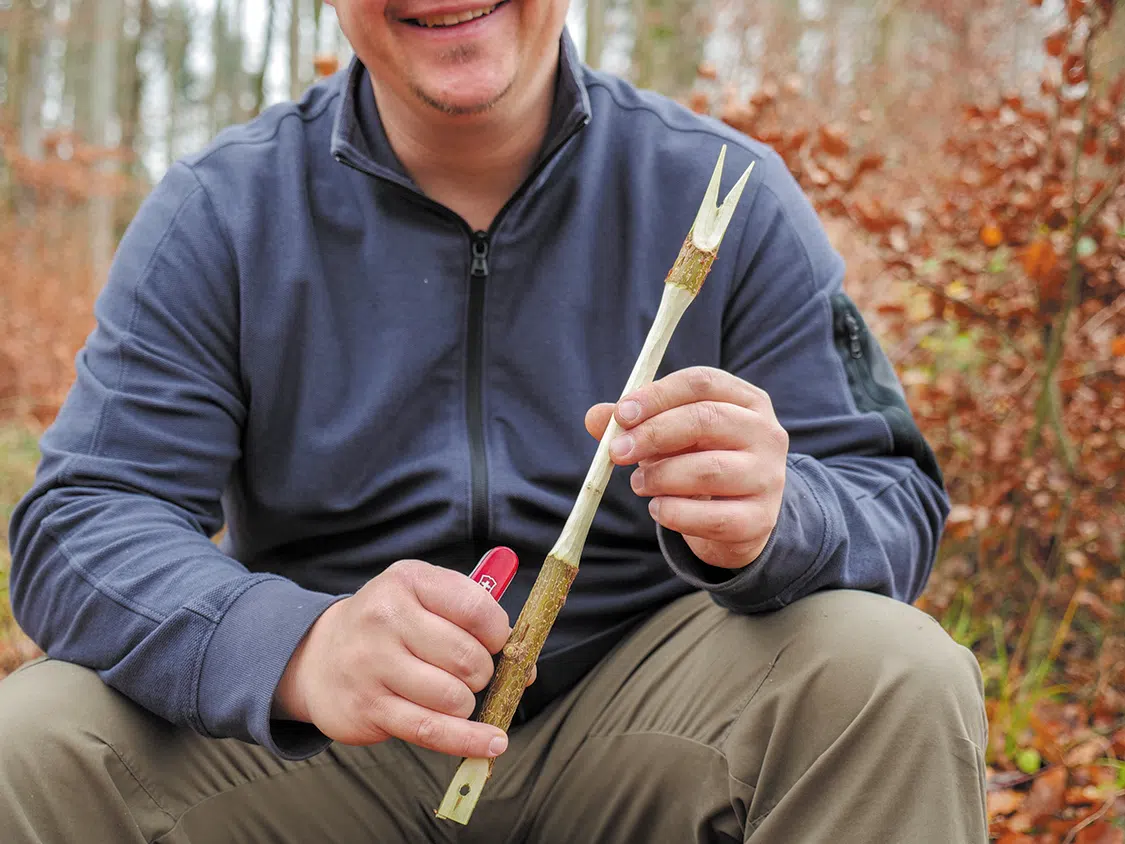 Also suitable for an easy introduction to carving is the practical fork. It consists of the handle, the stem and the prongs. First, we need a ¾ to 1 ¼ inch (2 – 3 cm) thick stick. Saw it to the desired length and carve two parallel surfaces on one side of the stick so that your stick looks like an oversized screwdriver (picture A). Then drill a hole in the surface with the awl (picture B). Then use the large blade to split out a “V”. To do this, place the tip of the large blade on one side of the hole and place the knife to almost form a point. Then hit the back of the knife with a strong branch (picture C). Repeat this process to split a V from the flat carved part of the stick. Voilà, the fork is ready for use (picture D). If you wish, you can remove the bark all the way to the handle or carve a pattern into the handle.
