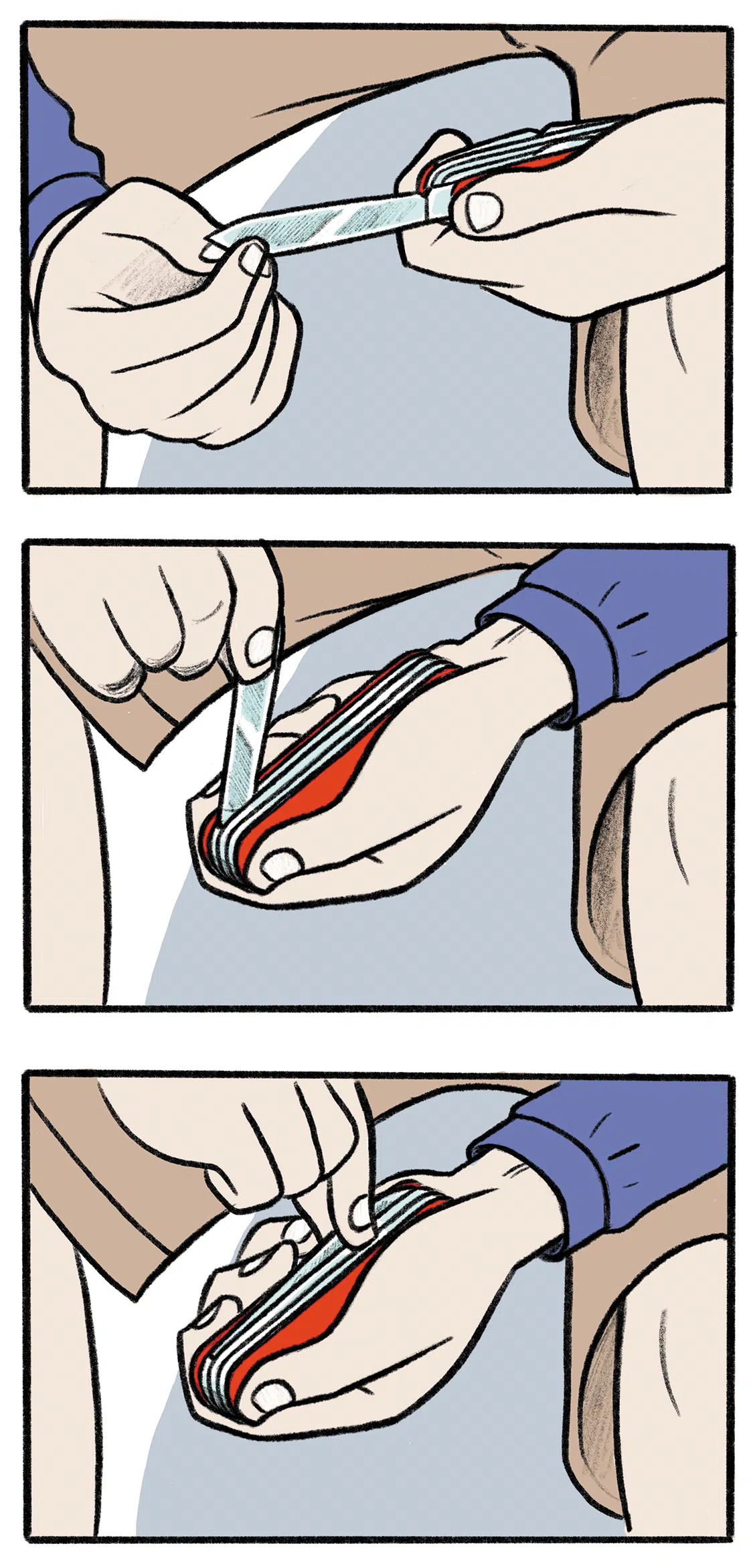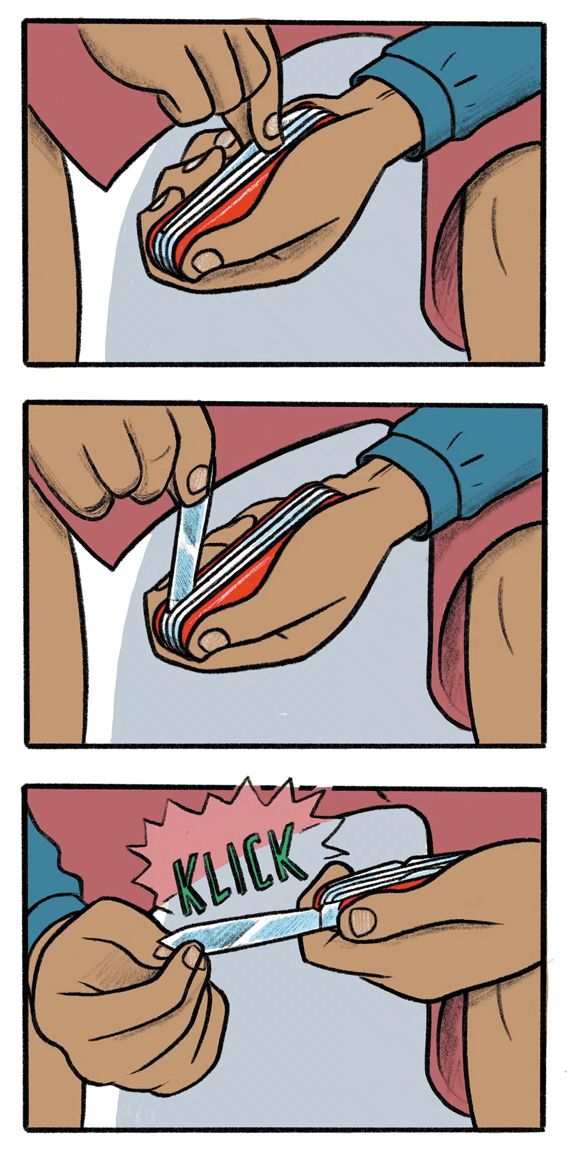 Take the knife in one hand so that the heel of the hand and thumb rest on one side. The remaining four fingers rest on the other side. This ensures a very stable grip. Grasp the notch with the thumbnail of the other hand and clamp the blade with the index finger on the other side. Pull out the blade and flip it open so that the open blade is facing away from you.