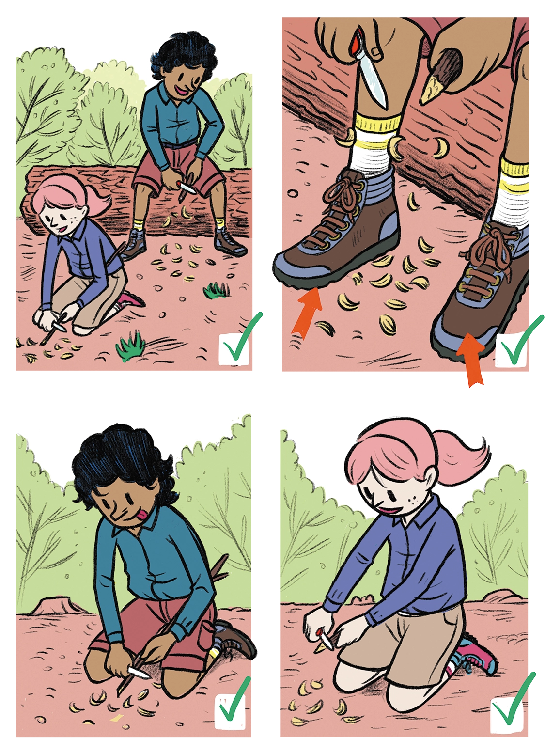 If children learn how to handle pocketknives properly at an early age, they will enjoy this hobby for the rest of their lives. Memorizing safety rules not only prevents injuries, but also teaches kids responsibility and discipline, important qualities when dealing with any knife. To make it fun to learn the rules, we have illustrated them vividly. The illustrations give kids a visual learning aid and just by looking at the pictures several of these important rules are easy to understand.