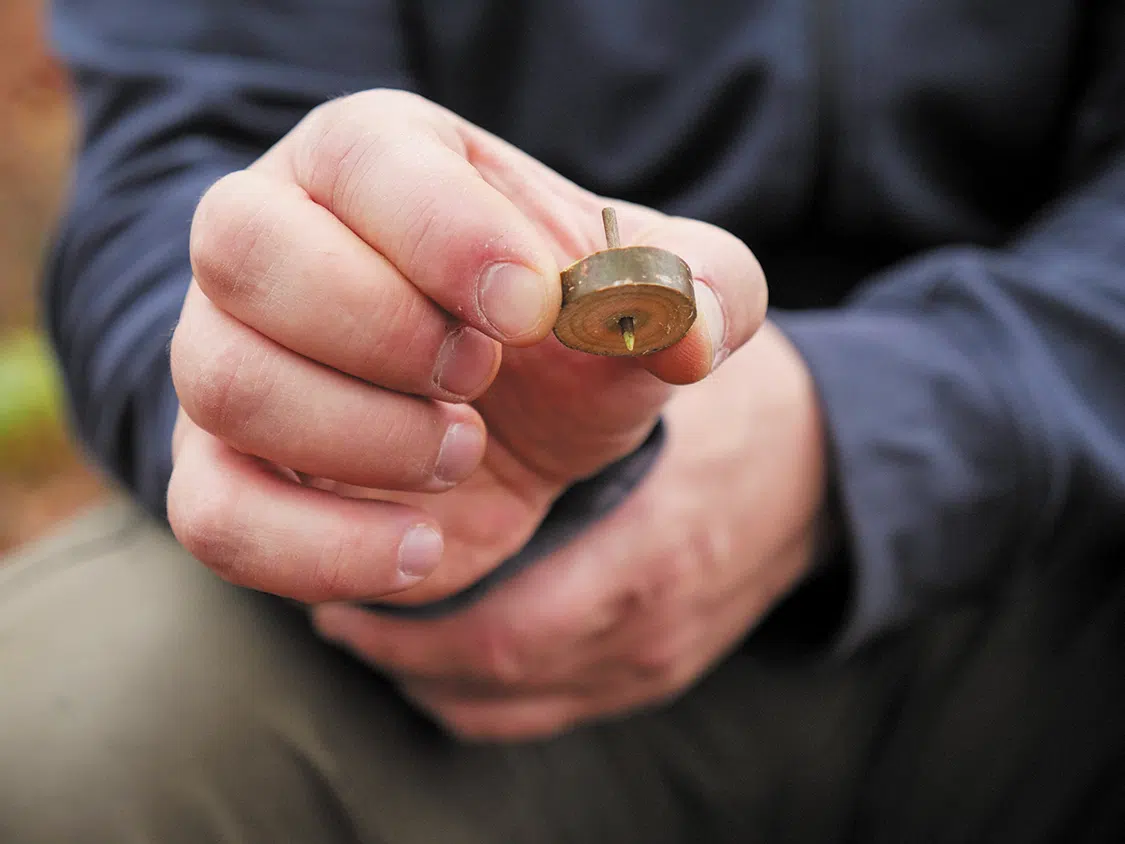 A spinning top made from a branch as thick as your thumb is the perfect way to start. First, find a piece of branch that is as round as possible with the pith in the middle. Then saw off a 1/8 – 1/4 inch (4 – 8 mm) thick slice with the cut surfaces as parallel as possible (picture A). Then, using the awl, drill a small hole through the pith of the flywheel from both sides (picture B). Now a dry twig is needed. From this, cut out an axle that is approximately 1 ¼ inch (3 cm) long, has grown straight and is 1/16 – 1/8 inch (2 – 3 mm) thin. Sharpen the axle a bit and push it through the hole in the flywheel (picture C). The axle should jam a little in the flywheel. If the spinning top does not run smoothly, rotating the axle or making a fine correction to the tip or outer contour can improve the runout. (picture D)