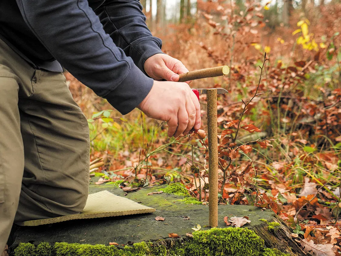 It’s very important that you are sitting down or kneeling when doing any carving or whittling. Both feet should be on the ground. The only exception would be when sawing something—here you could place a knee or a foot on something such as a tree stump and use it to stabilize the wood you are sawing while the other foot remains on the ground.