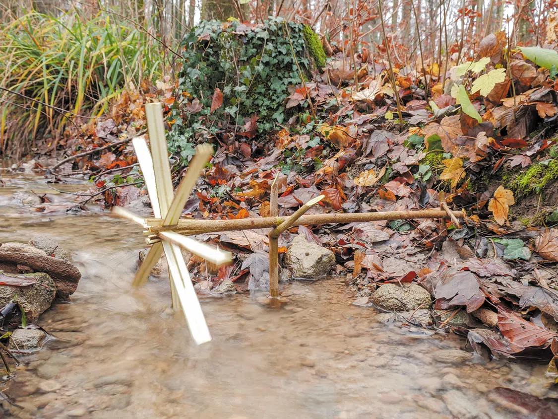Now you can determine how wide the groove for the second pair of paddle wheels must be. Saw these grooves slightly above the middle of the width of the paddle and pin all boards together to form a star (picture D). Now split four times on the front side of the axle with the large blade. Start with a cross, then add two more gaps at a 45-degree angle. By turning the blade, you can lengthen the gaps until they are about 4 inches (10 cm) deep. Find small branches and spread the gaps with them (picture E). Then press the paddle wheel onto the axle. This is a bit challenging. Now you can put the water wheel into the current of a stream (picture F).