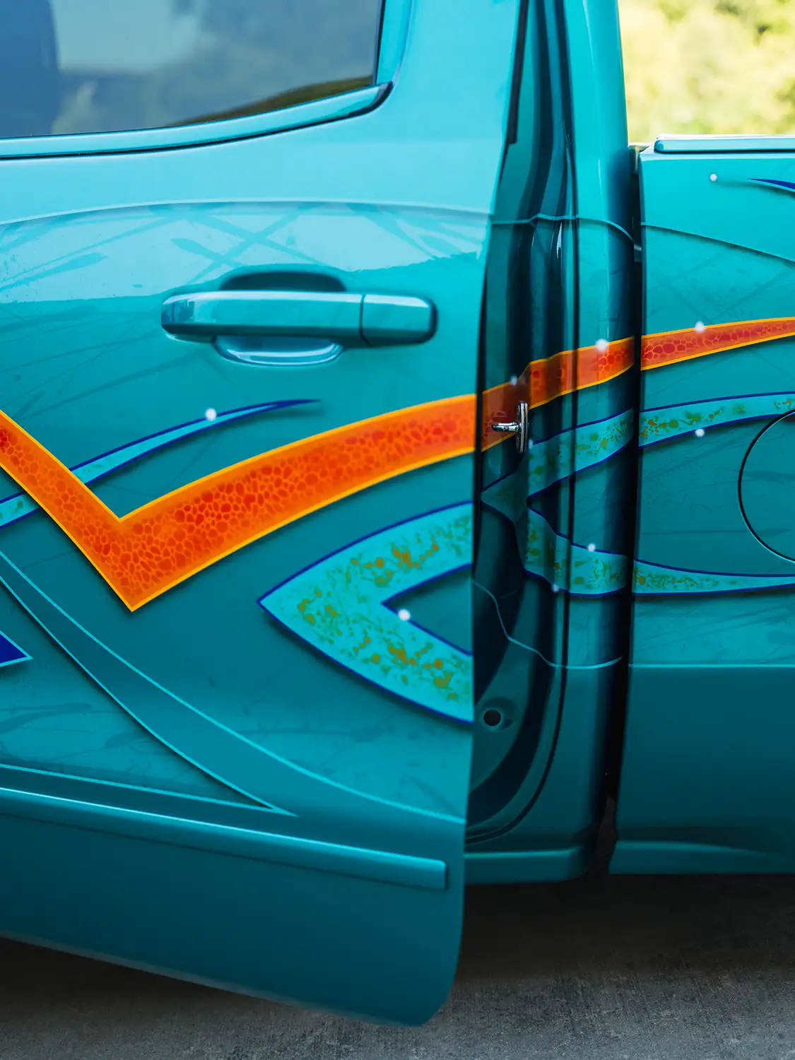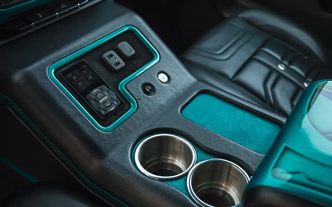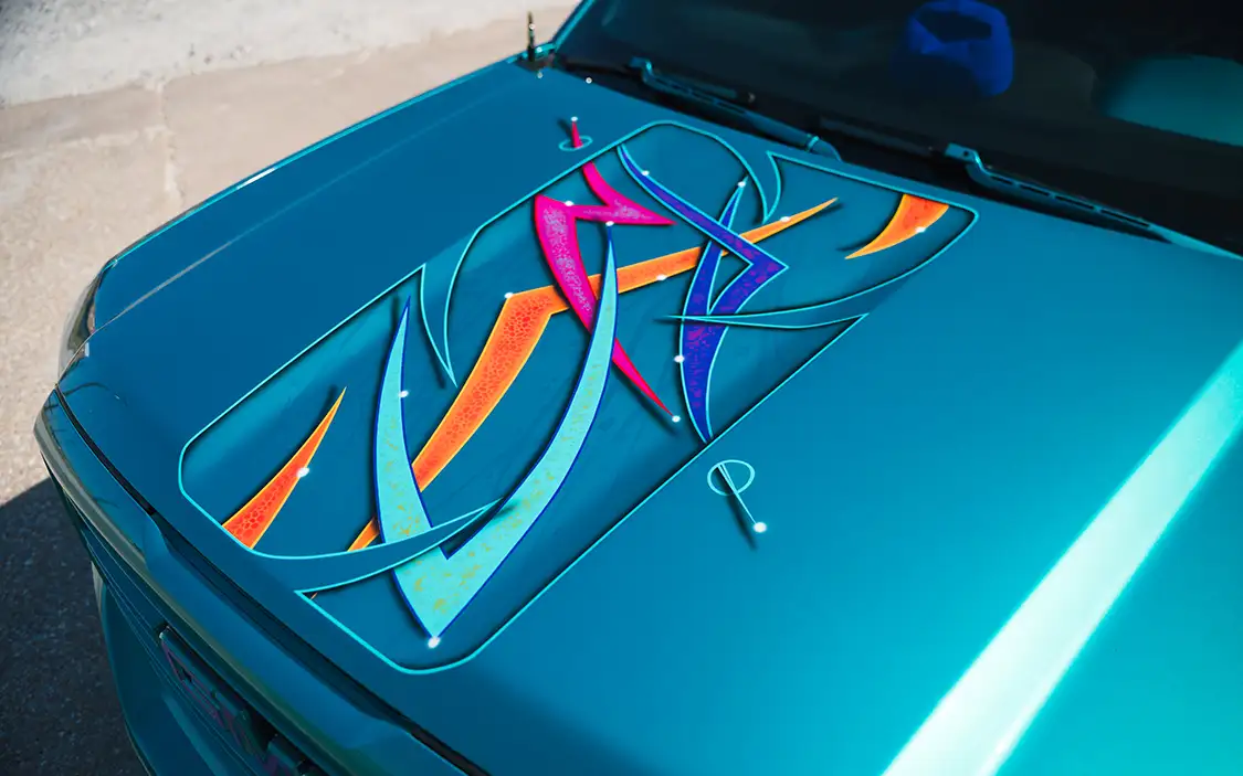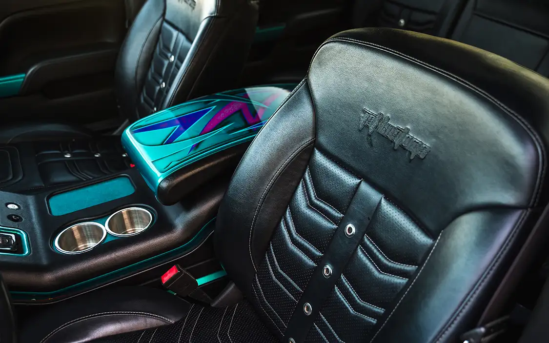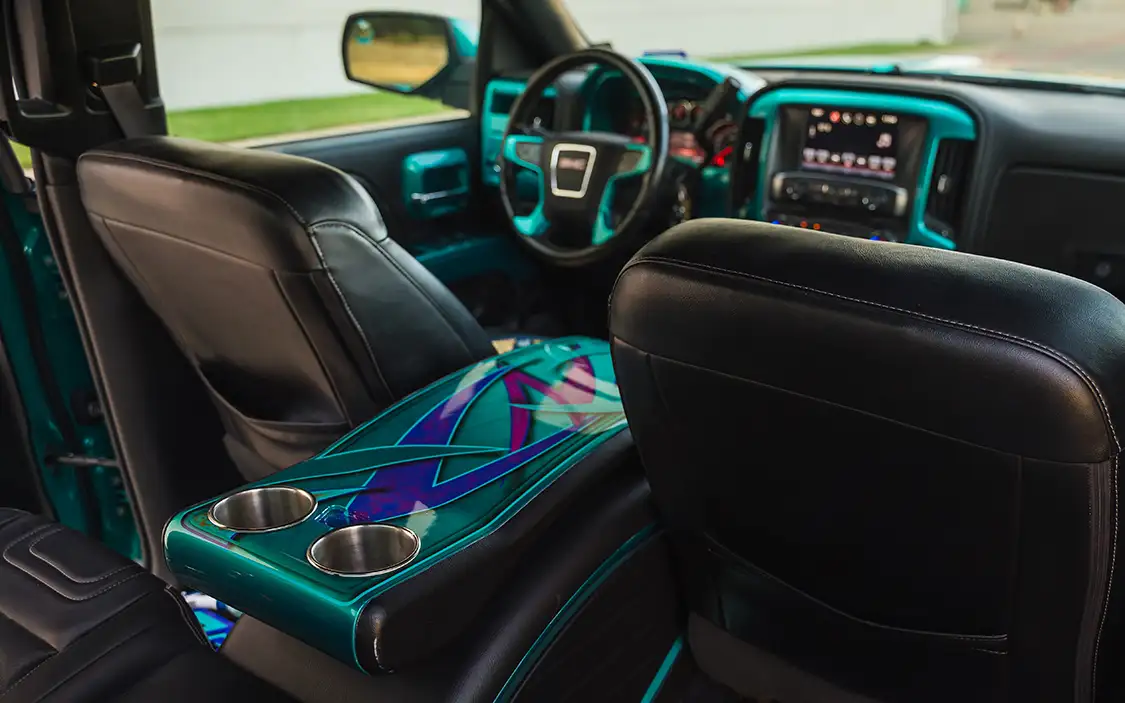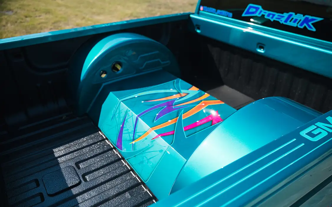 Body modifications were kept sleek and purposeful. Custom wheeltubs were fabricated to accommodate the oversized wheels, and the entire truck was sprayed in Akzo Nobel teal green by Draztik in Fort Worth. To tie everything together, Enrique added tribal graphics that run along the body, adding a touch of flair without overwhelming the build.