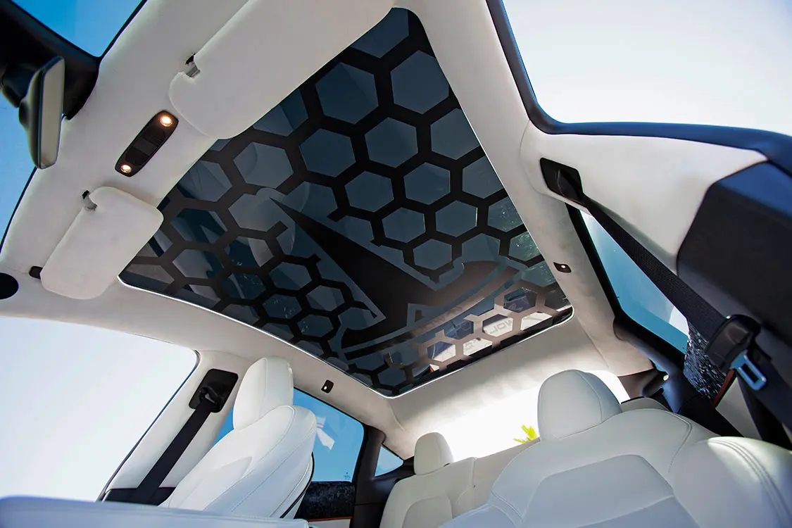 Every element of Karma’s exterior has been carefully curated to perfection, including the tinted headlights, Hansshow taillights, sleek carbon-fiber hood, and unique one-off honeycomb vinyl design on the glass roof—stunning from the inside and slightly reducing sunlight exposure—perfect for the Nevada desert climate.