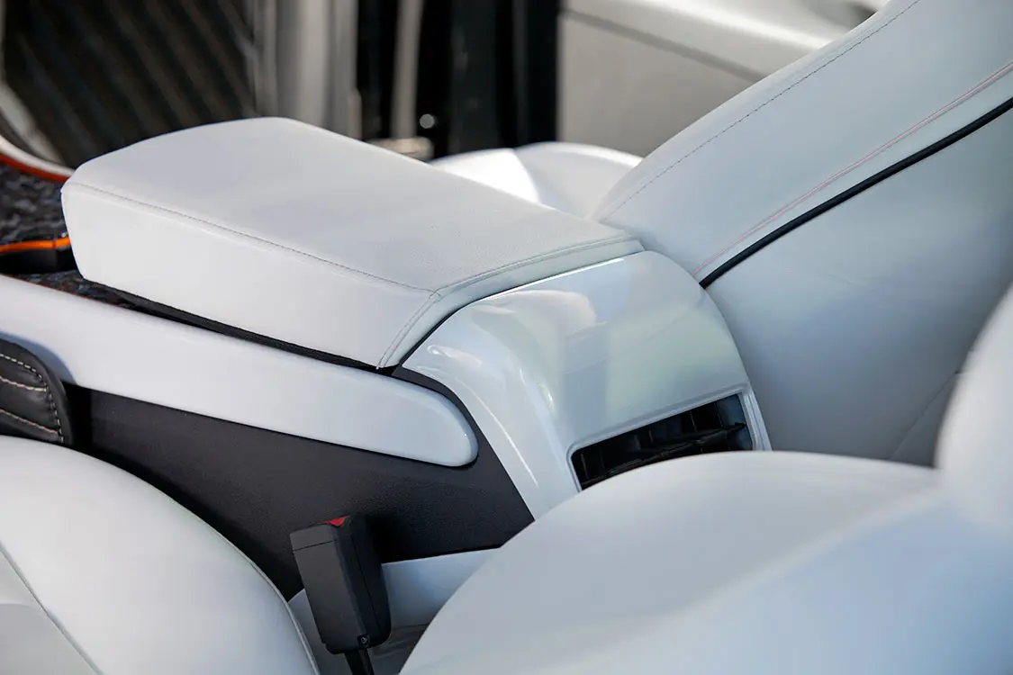 • Seats: Stock white with added rear white leather, along with white suede wraps on the ceiling and pillars