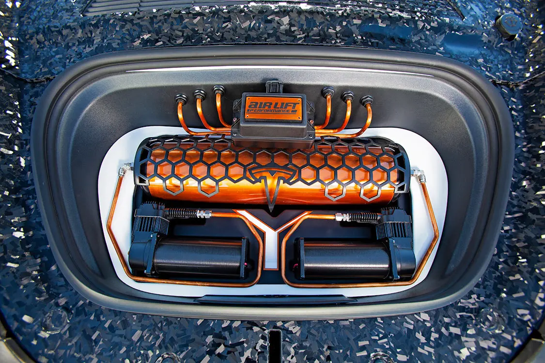 But Karma’s beauty isn’t just skin-deep. Brett turned to the skilled team at Shawn Robinson’s Old Man Customs for the chassis and suspension modifications to ensure the perfect balance between style and functionality. They worked tirelessly to create a unique setup, allowing Karma to be the first Model Y to lay its body on the ground. It consists of an Air Lift Performance air-ride system paired with Air Lift shocks, MPP upper control arms, and a custom sway bar—they guarantee an unrivaled smooth ride and superb control on twisty roads just outside Sin City. Last, hidden in the frunk, we find a custom-painted FLO air tank to match the wheels. It sits on custom fabricated mounts and is coupled to two Viair 480 air compressors, wrapped in the same vinyl as the car’s exterior.