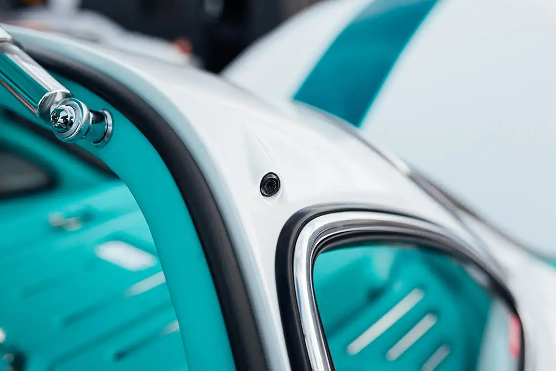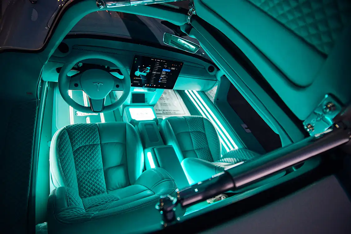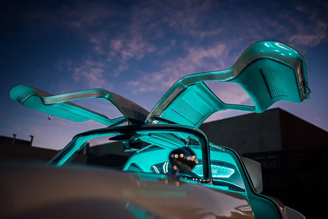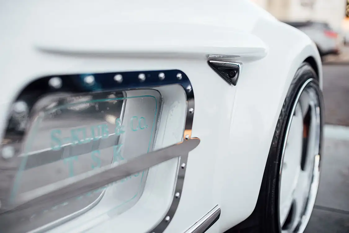 The interior of the Tesla Gullwing received an overhaul composed of original Tesla components, from the steering wheel to the central screen and seats. Everything is upholstered in rich turquoise leather by California Upholstery. The cabin exudes elegance while maintaining Tesla’s minimalist and functional design ethos. All of Tesla’s advanced features, such as the autopilot and sensor systems, are fully operational. This ensures that the Tesla Gullwing looks the part and performs reliably and efficiently. Integrating cameras in place of traditional mirrors enhances safety and modernizes the driving experience, allowing for a clear view when changing lanes. Moreover, the original FSD camera has been discretely integrated into the roof, front wings and top of the screen, just like on the Model 3. The charge port follows the same concept, being fully integrated into the body yet keeping its motorized function.