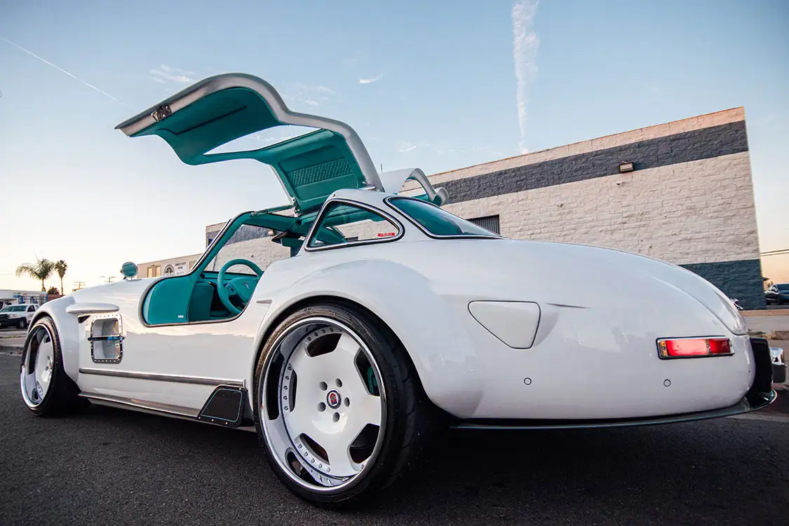 The body of the Tesla Gullwing is a masterful combination of lightweight fiberglass and carbon fiber. These materials were chosen not only for their strength and durability but also to maintain the weight specifications crucial for the car’s performance and handling. The bespoke carbon body kit and modern wheels, along with expanded arches, give the 300 SL a contemporary yet classic appearance.