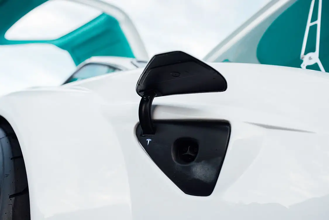 The interior of the Tesla Gullwing received an overhaul composed of original Tesla components, from the steering wheel to the central screen and seats. Everything is upholstered in rich turquoise leather by California Upholstery. The cabin exudes elegance while maintaining Tesla’s minimalist and functional design ethos. All of Tesla’s advanced features, such as the autopilot and sensor systems, are fully operational. This ensures that the Tesla Gullwing looks the part and performs reliably and efficiently. Integrating cameras in place of traditional mirrors enhances safety and modernizes the driving experience, allowing for a clear view when changing lanes. Moreover, the original FSD camera has been discretely integrated into the roof, front wings and top of the screen, just like on the Model 3. The charge port follows the same concept, being fully integrated into the body yet keeping its motorized function.