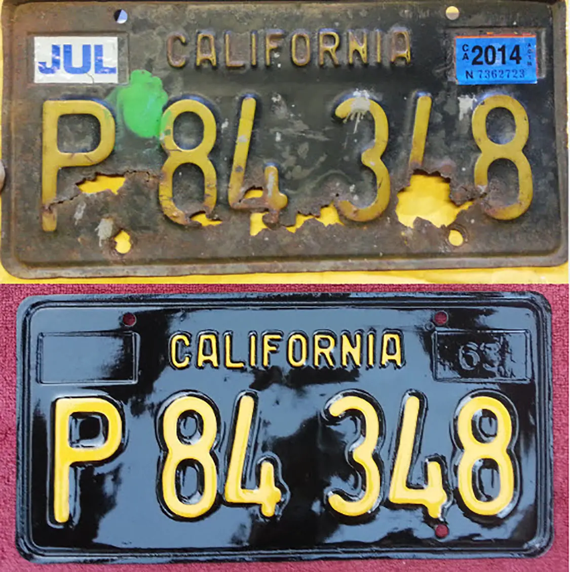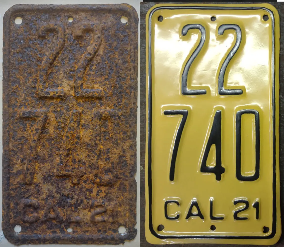 These plates are all original DMV issues. There are no reproductions. I don’t make the plates. I restore the old ones that the DMV has made. Once restored, I sell them and then people can put them on their cars and register them under that number.