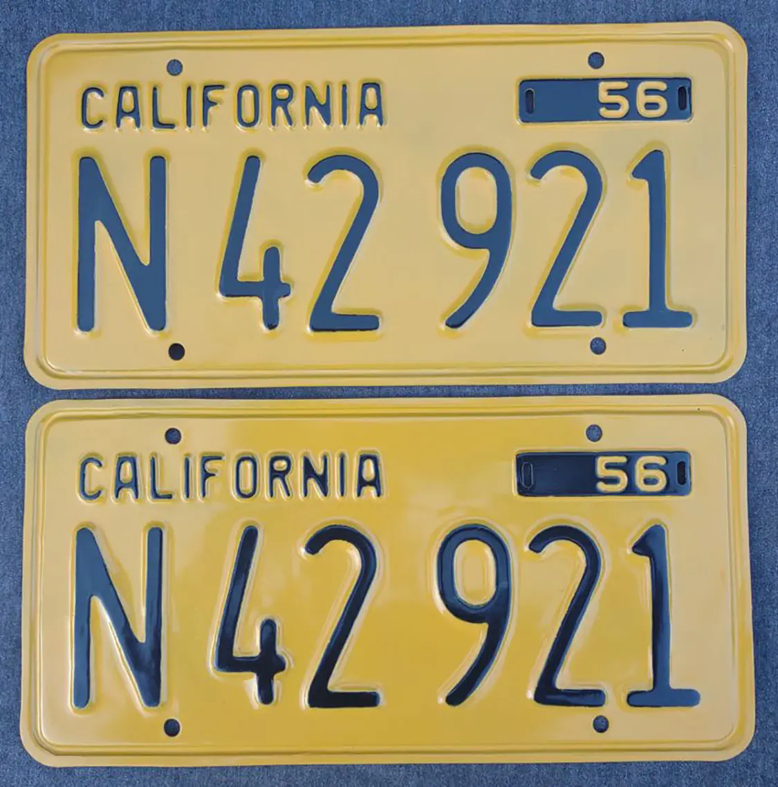 I sell original, DMV-issued plates ranging from 1914 to 1980 which are registered under the DMV’s “Year Of Manufacture” (YOM) program. This allows you to register a car with the plates that match the year the car was built, with the correct colors for that particular year.