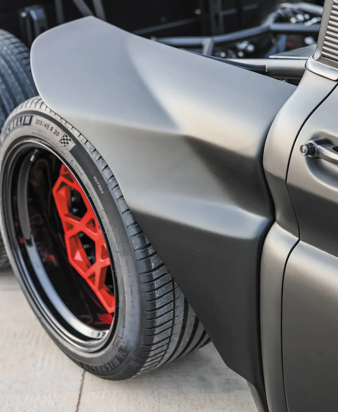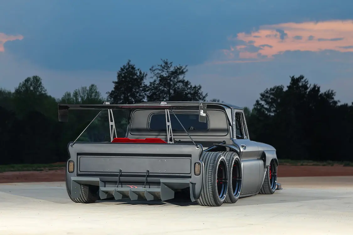 While an entire issue could be dedicated to this truck’s individual specs alone, we’ll go ahead and move on from its wicked performance gains to another aspect that initially lures attention from onlookers. When first mocking up the design of the C10 Slayer as this truck has been dubbed, Brad imaged it to have a JDM-inspired wide body design without the use of proper bedsides as to show off all the internal components that make this truck so unique. To help bring the rendering that only existed on the computer screen to life, Advanced Fiberglass Concepts joined the project to machine the wide body parts, front diffuser, rear fenders and the wing connected to the back of the cab from foam before it was molded into their final fiberglass form. Even though this C10 lacks a proper box, it does have a one-off tailgate panel that contains portions of the rear fenders to create the correct visual proportions.